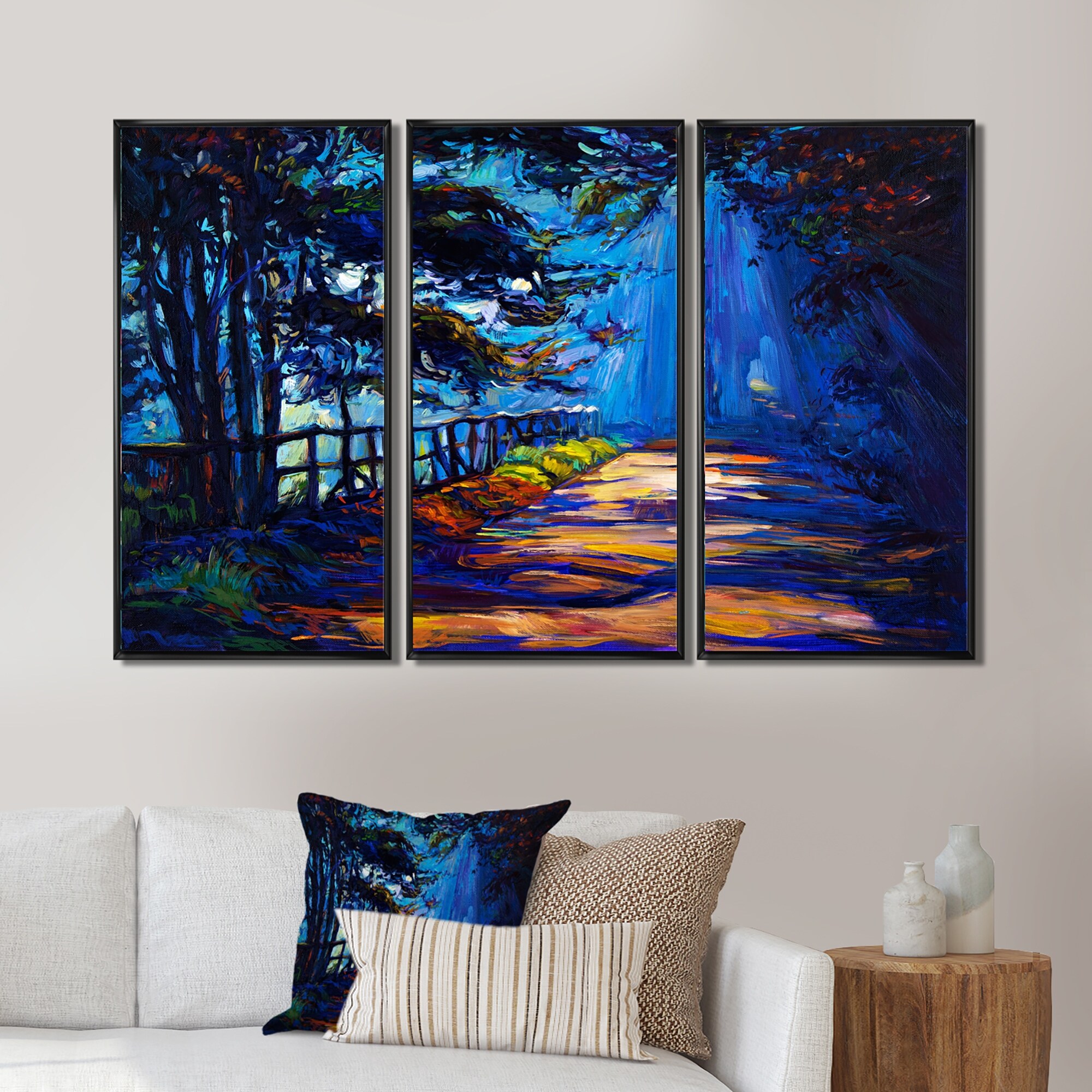 Designart "Rural Road Through the Meadow Under Full Moon" Nautical & Coastal Framed Art Set of 3 - 4 Colors of Frames