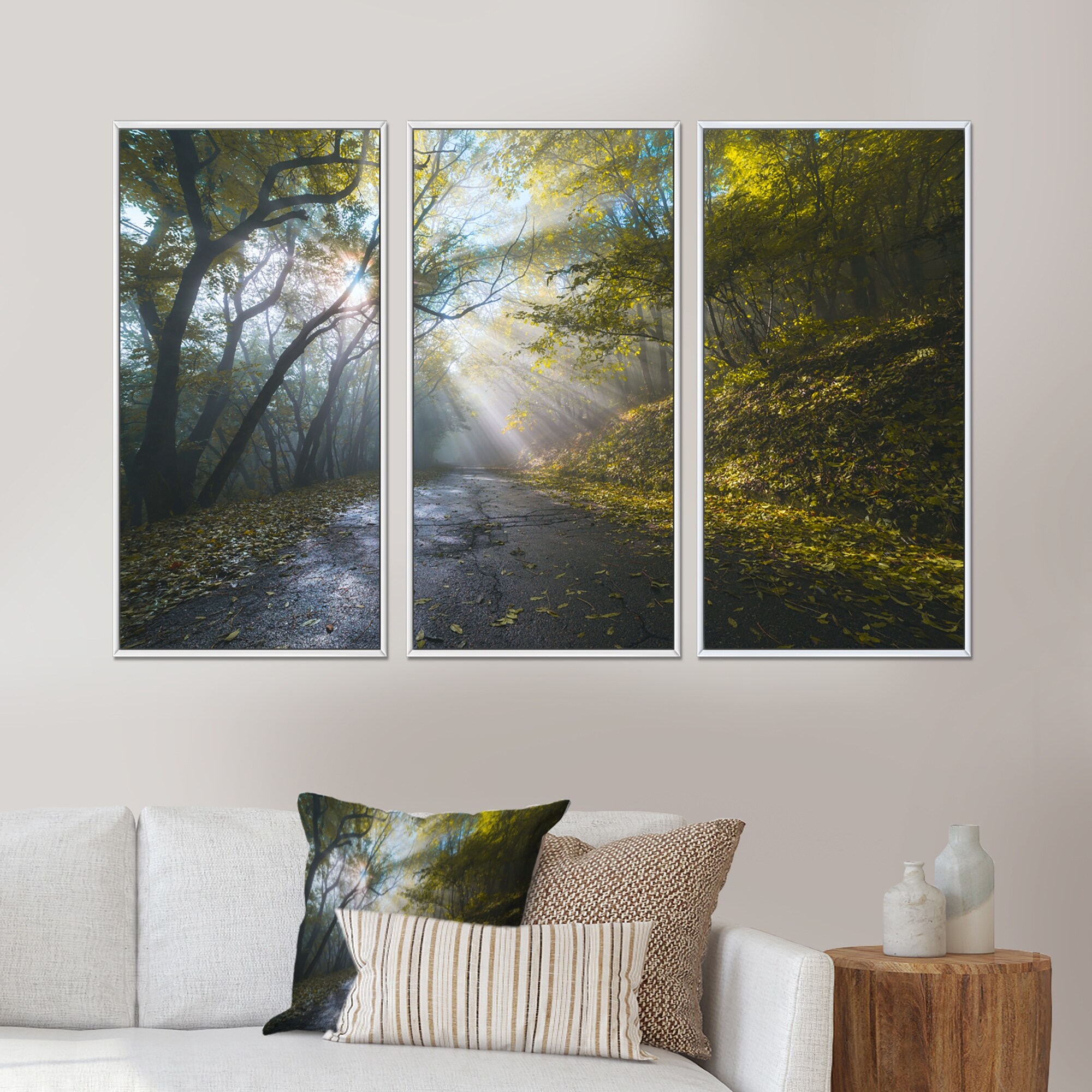 Designart "Road in Autumn Forest at Sunset" Landscape Framed Wall Decor Set of 3 - 4 Colors of Frames