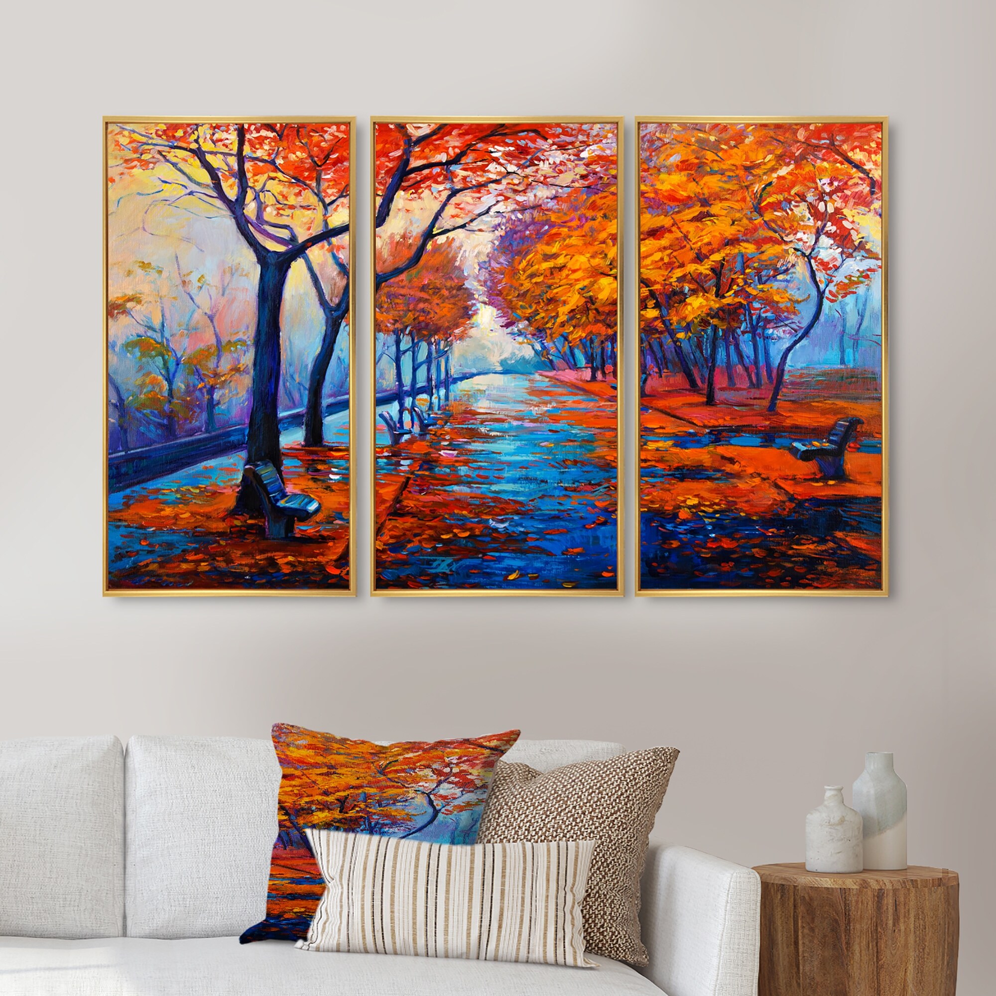 Designart "Road through Thick Fall Forest" Forest Framed Canvas Wall Art Set of 3 - 4 Colors of Frames