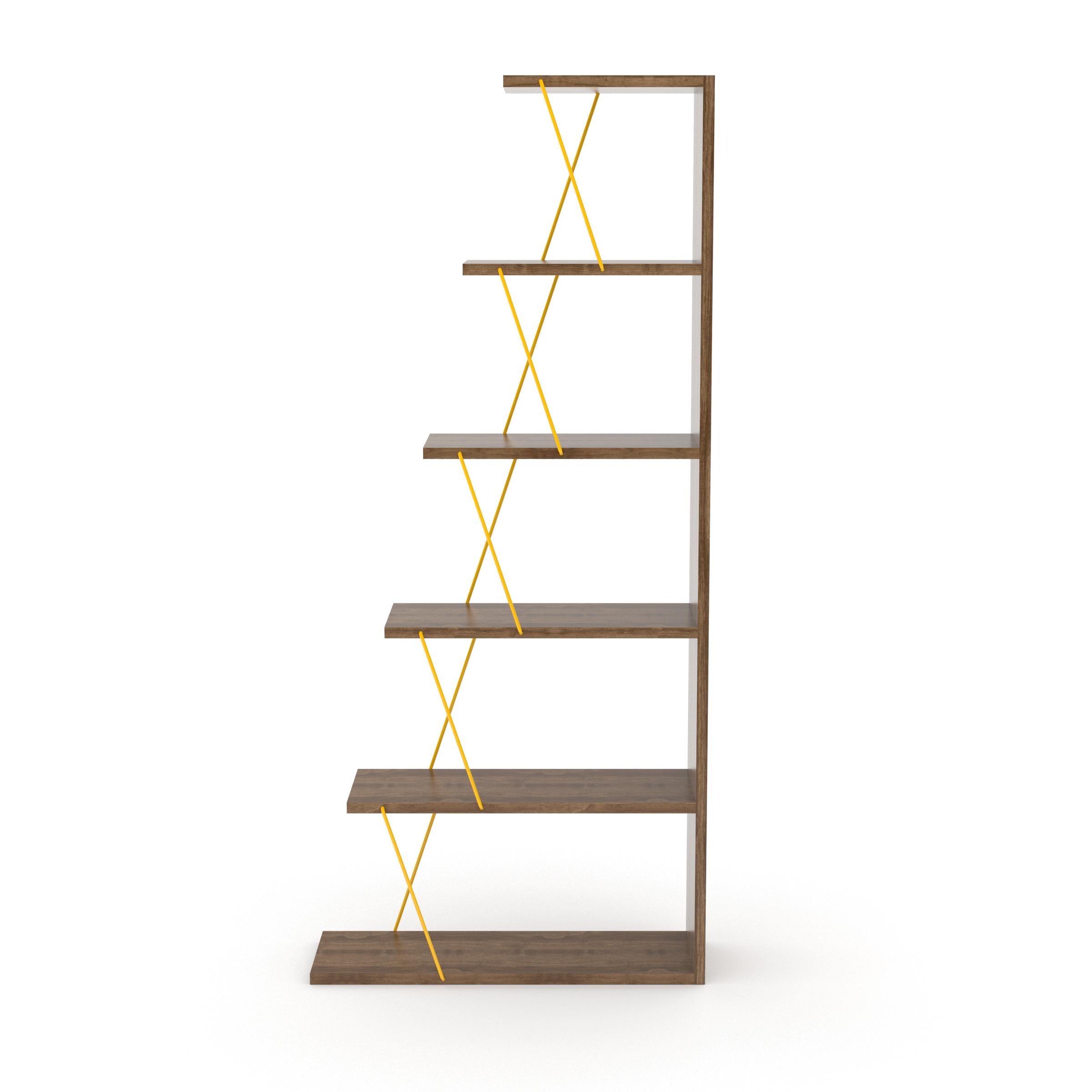 5 Tier Ladder Narrow Bookshelf Organizers for Small Spaces Office Furniture, Walnut/Yellow