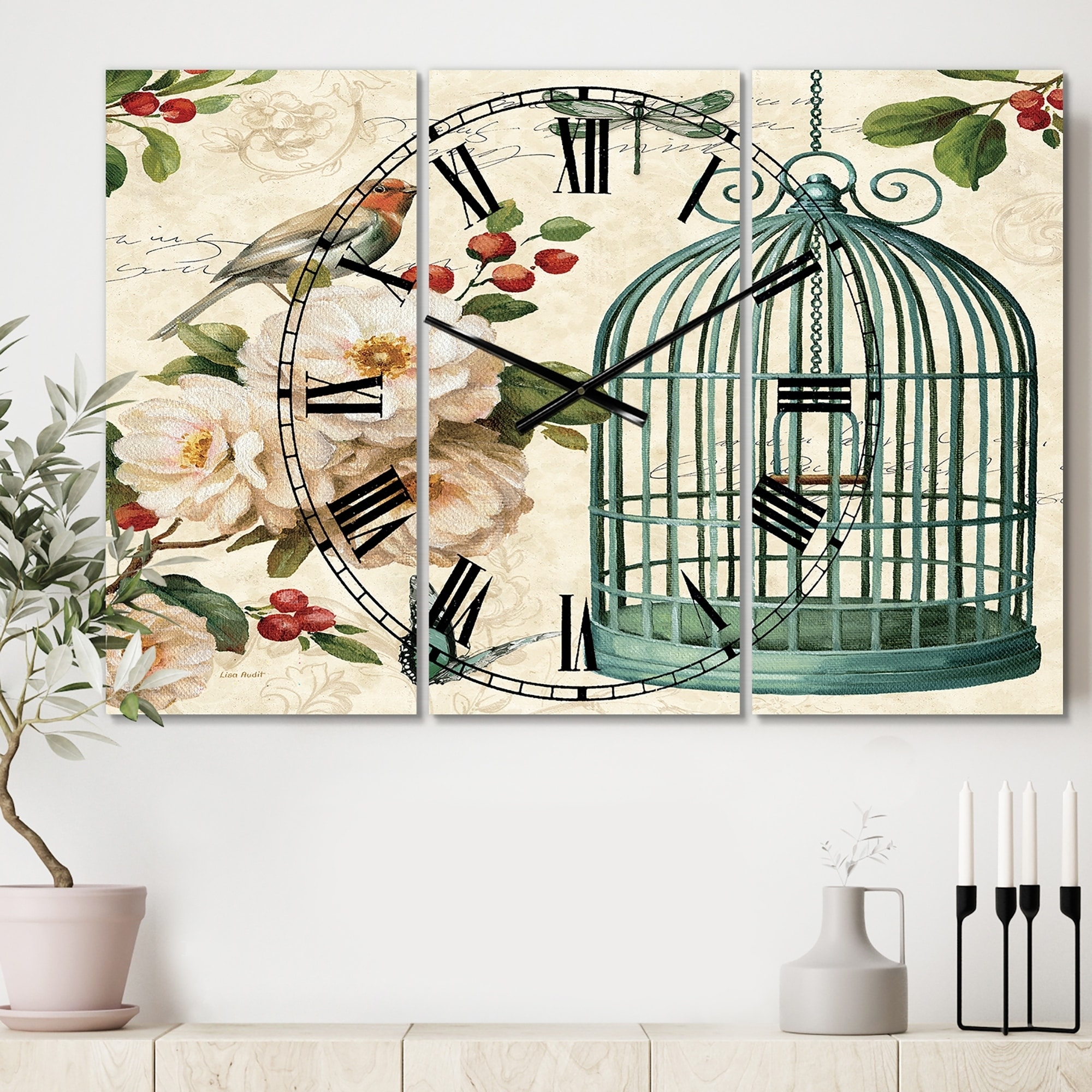 Designart 'Blue Cottage Bird, Birdcage and Apple Blossoms II' Cottage 3 Panels Oversized Wall CLock