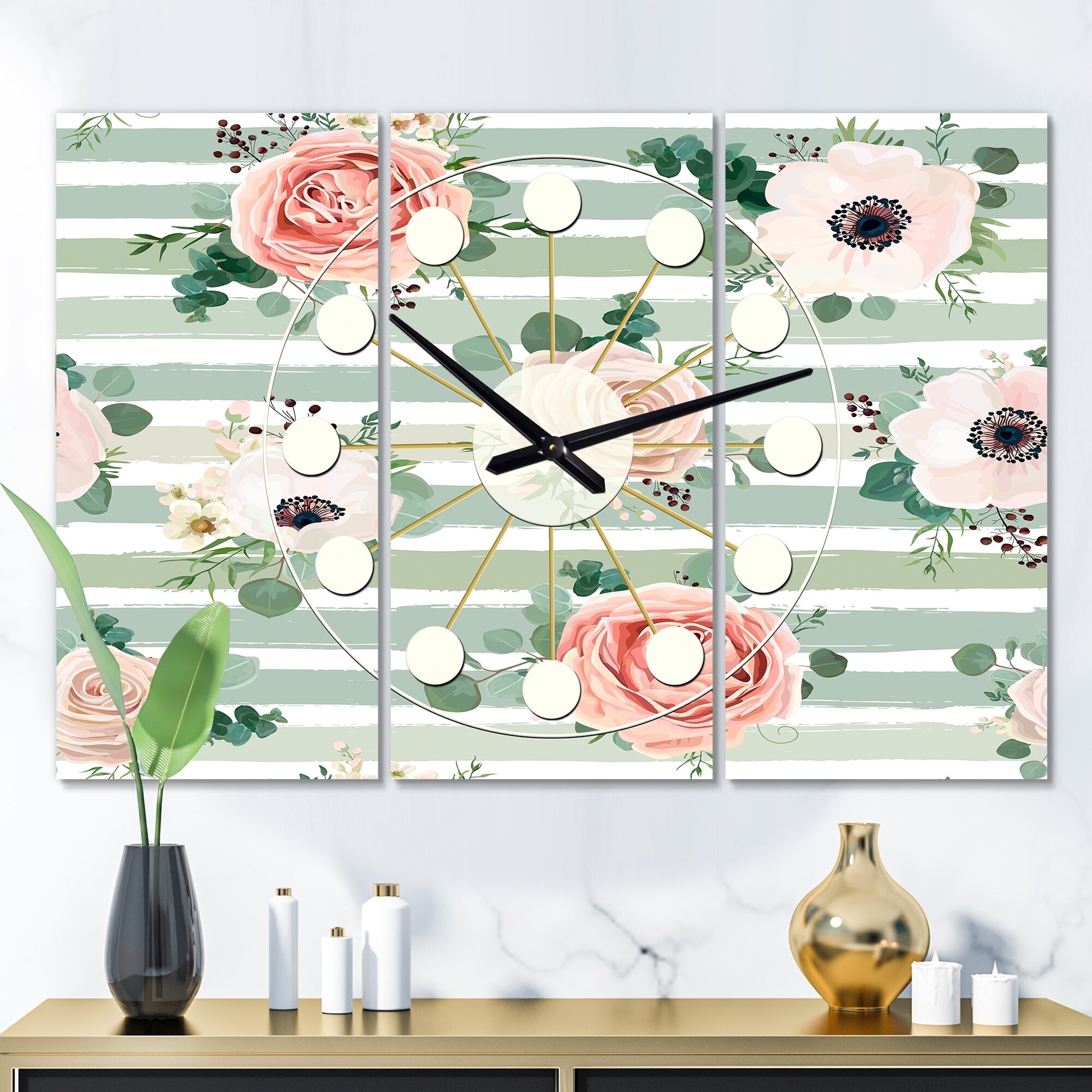 Designart 'Floral Retro Pattern V' Oversized Mid-Century wall clock - 3 Panels - 36 in. wide x 28 in. high - 3 Panels