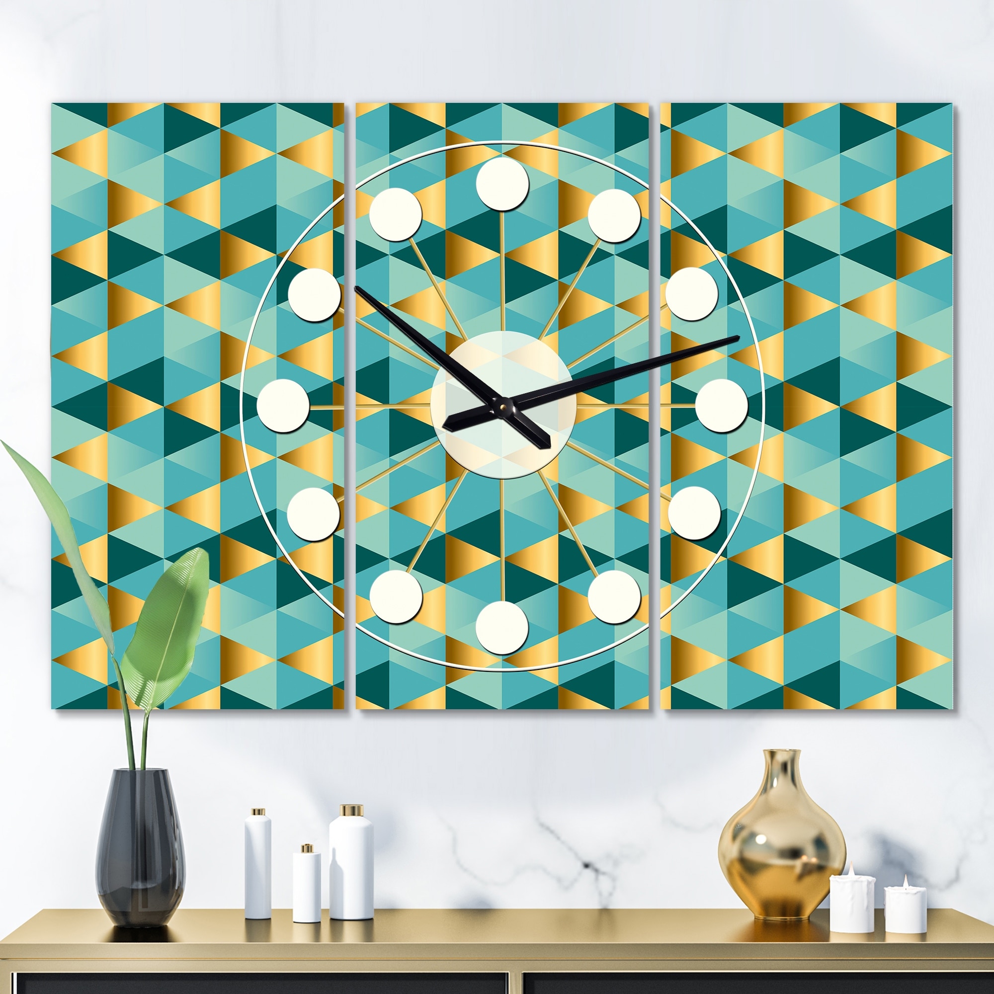 Designart 'Retro Hexagon Pattern VII' Oversized Mid-Century wall clock - 3 Panels - 36 in. wide x 28 in. high - 3 Panels
