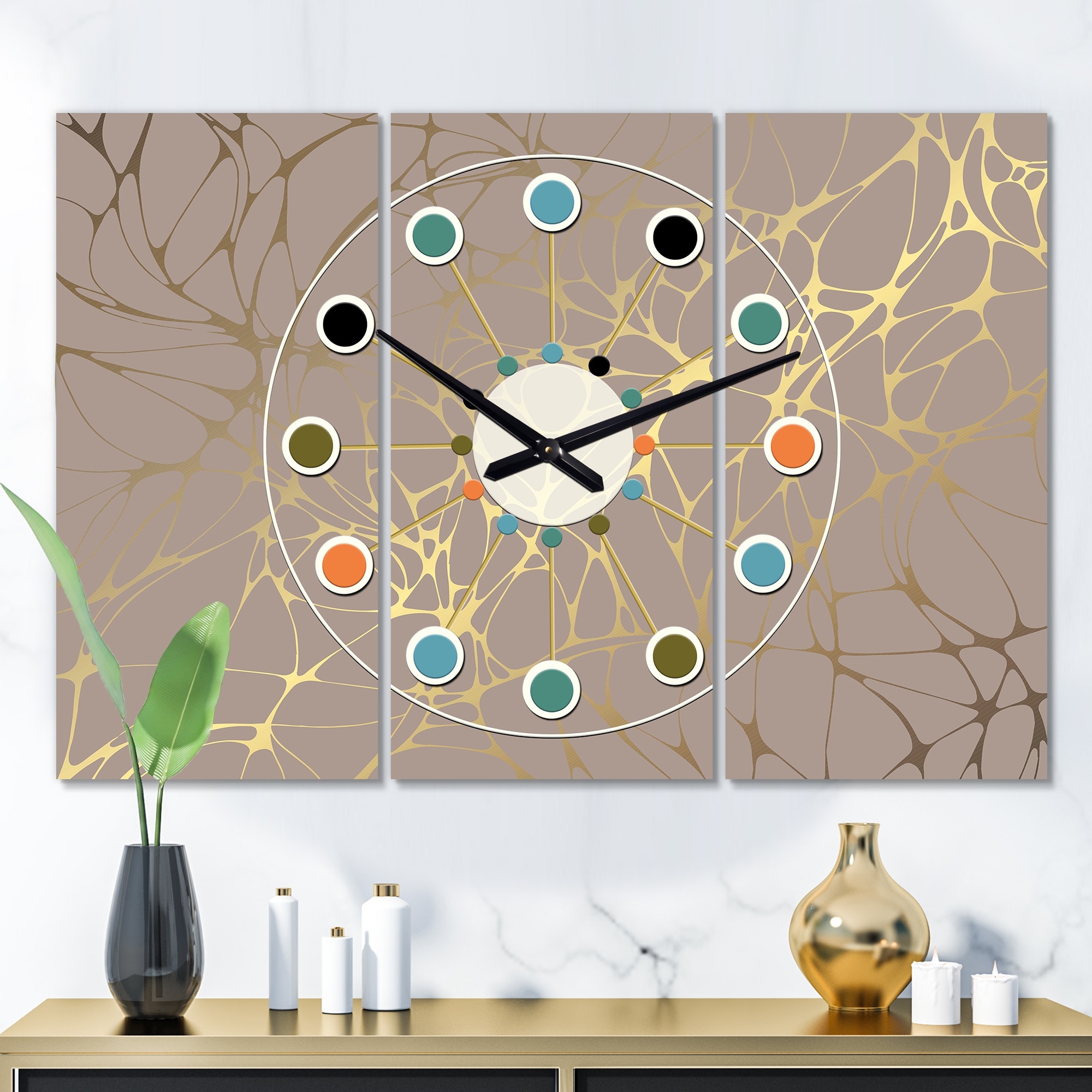 Designart 'Golden Marble Design II' Oversized Mid-Century wall clock - 3 Panels - 36 in. wide x 28 in. high - 3 Panels