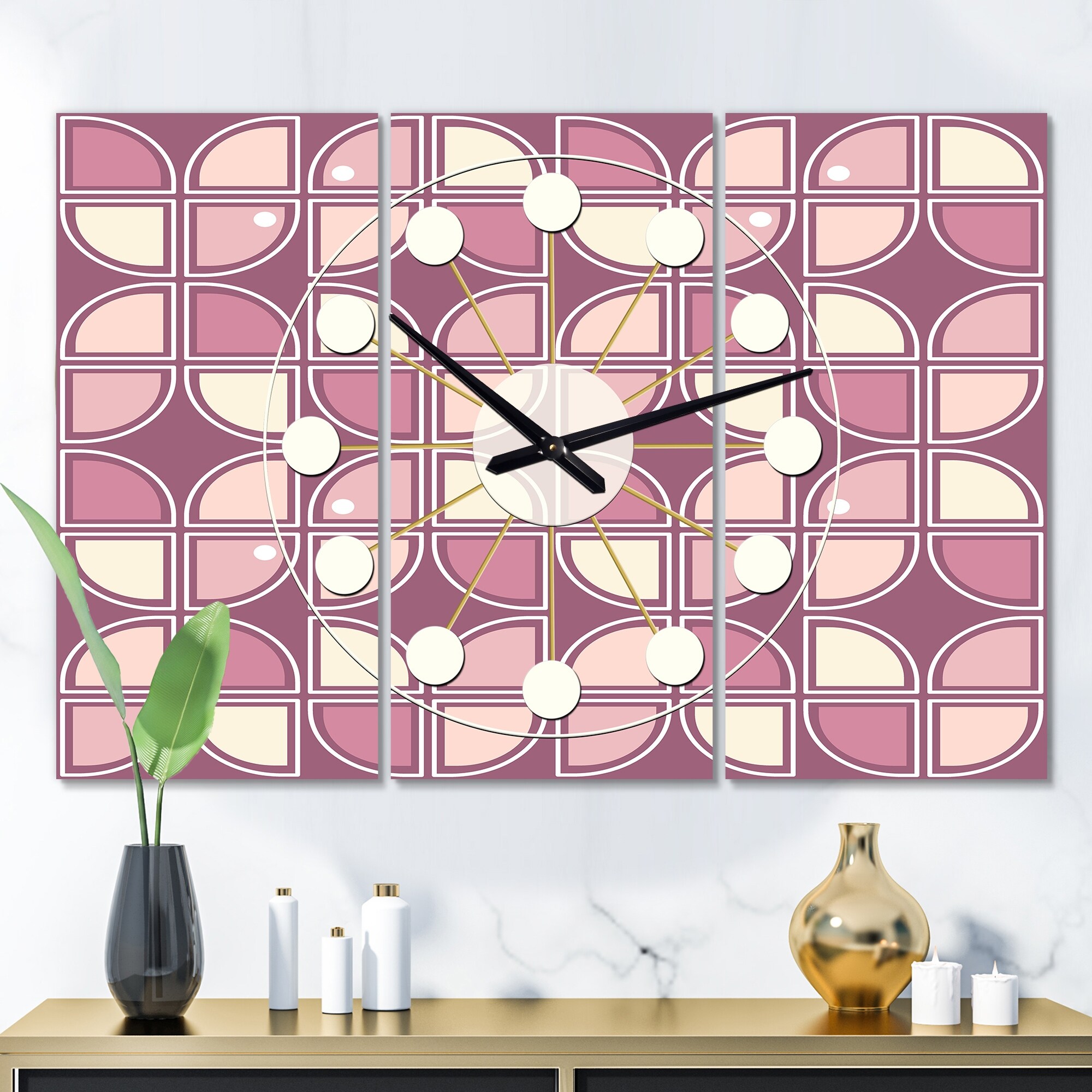 Designart 'Retro Purple Pink Desing' Oversized Mid-Century wall clock - 3 Panels - 36 in. wide x 28 in. high - 3 Panels
