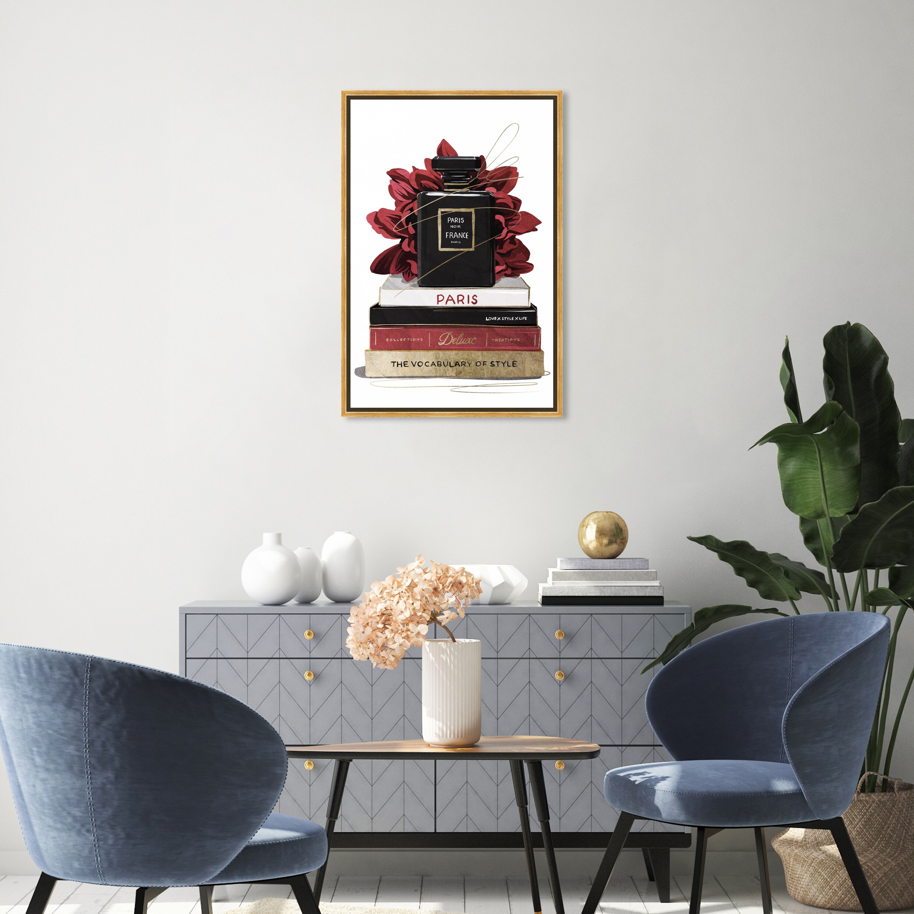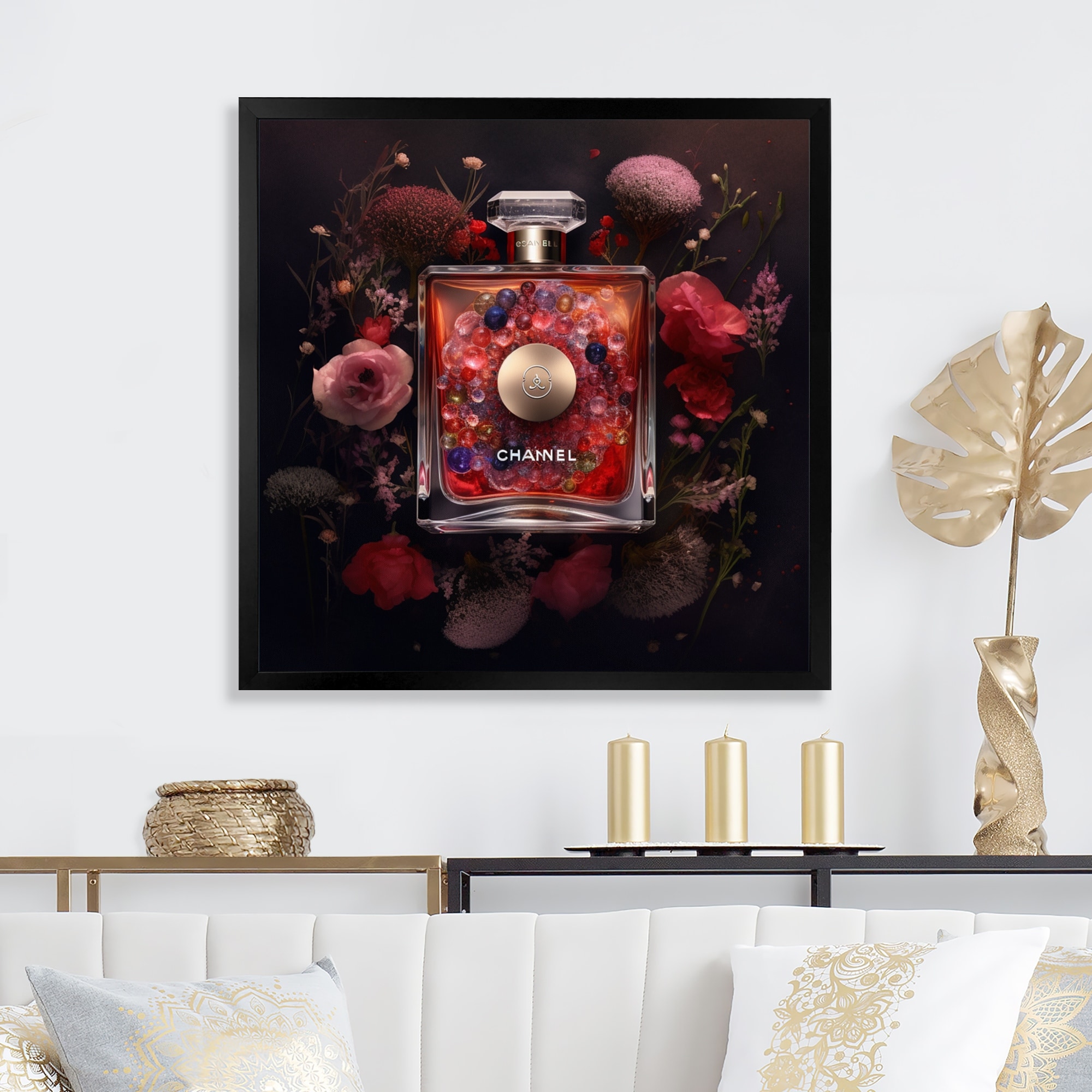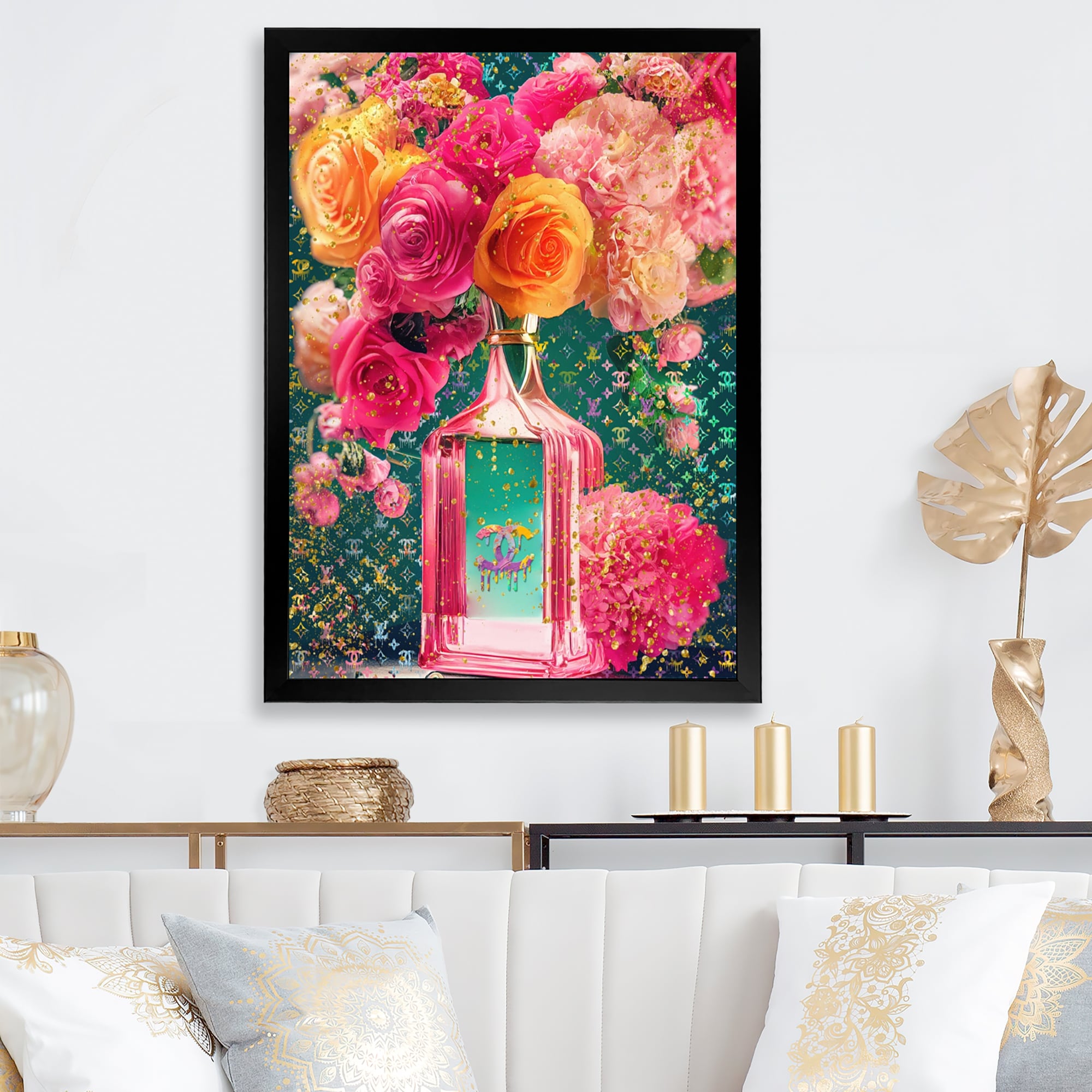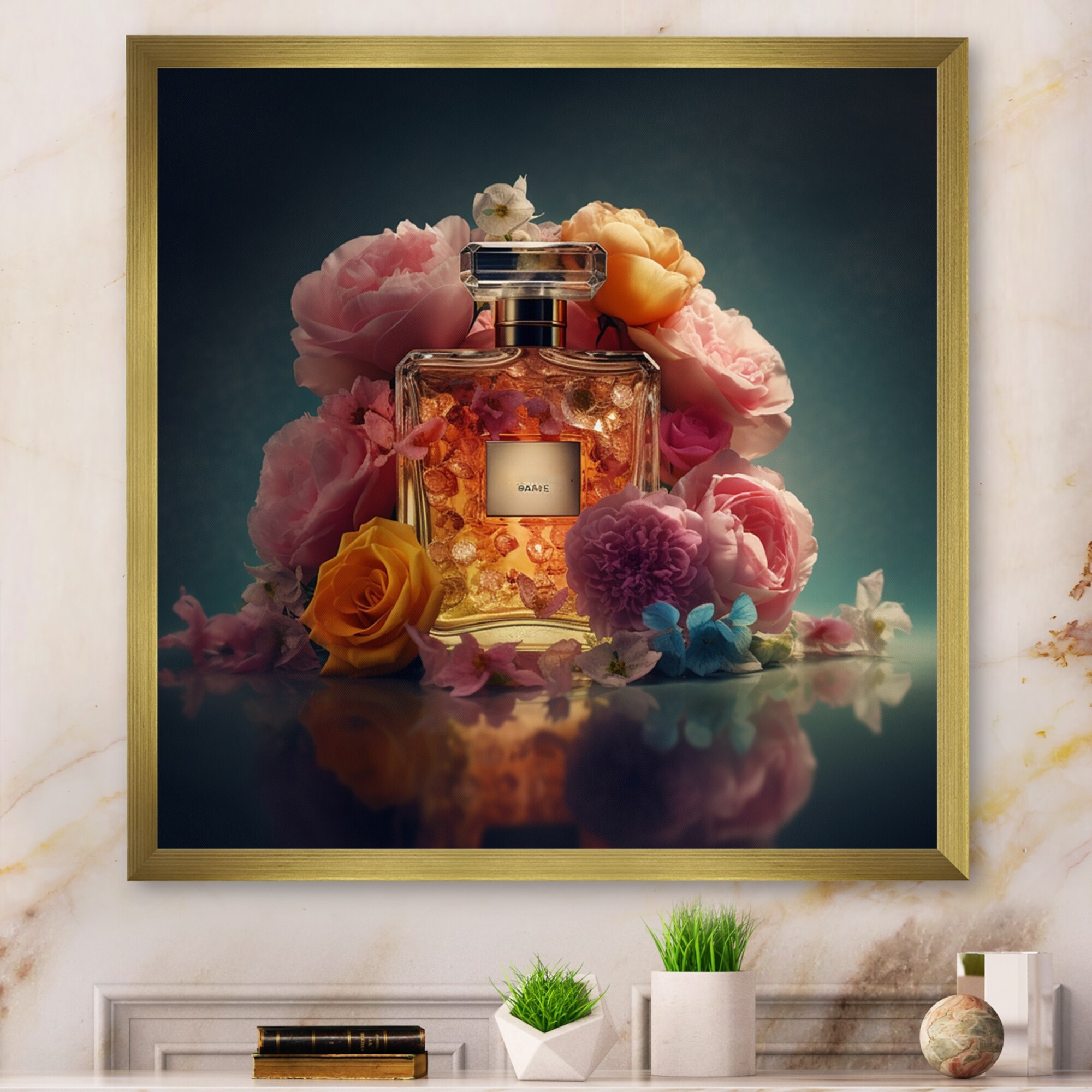 Designart "High Fashion Perfume Bottle Vase With Flowers II" Fashion Framed Art Print