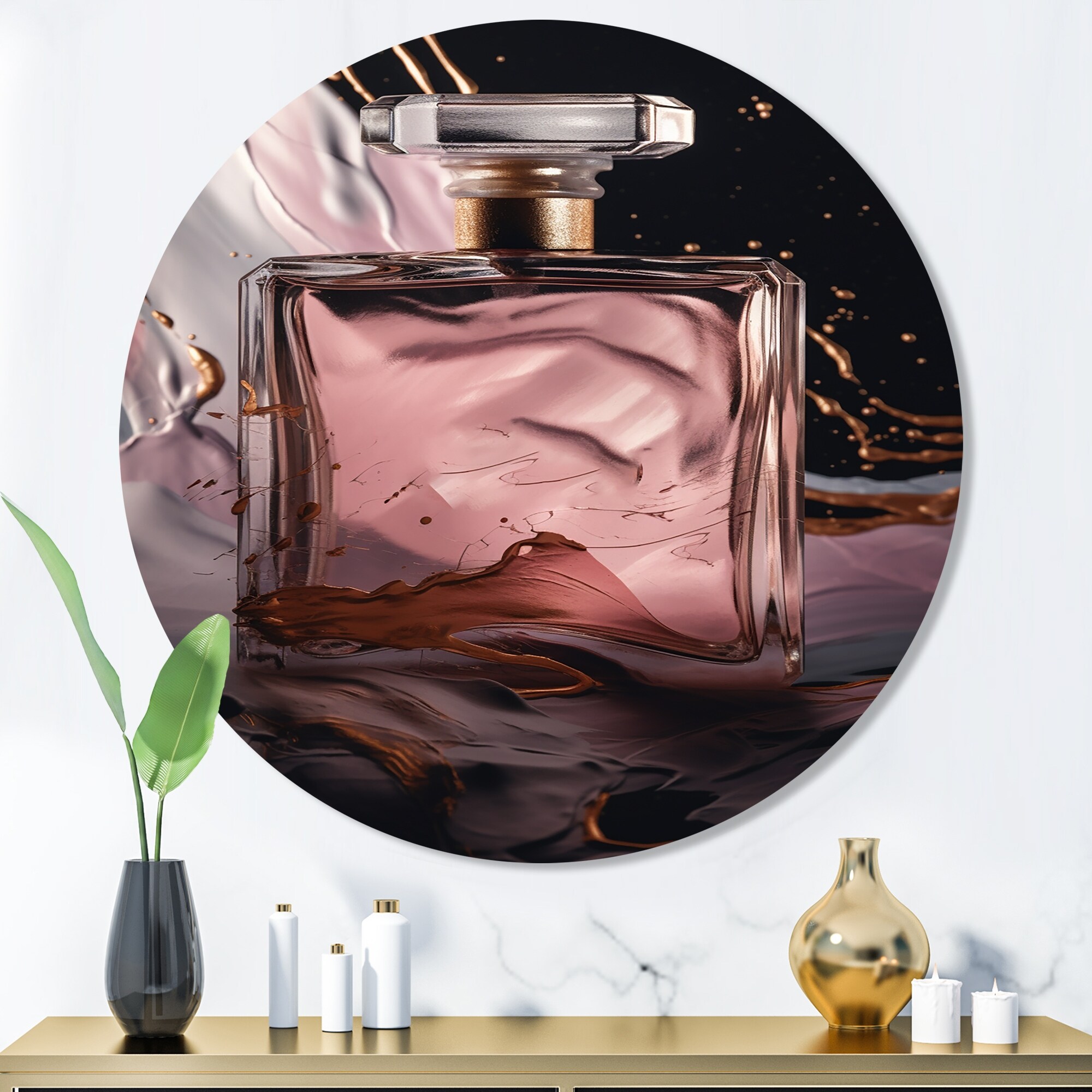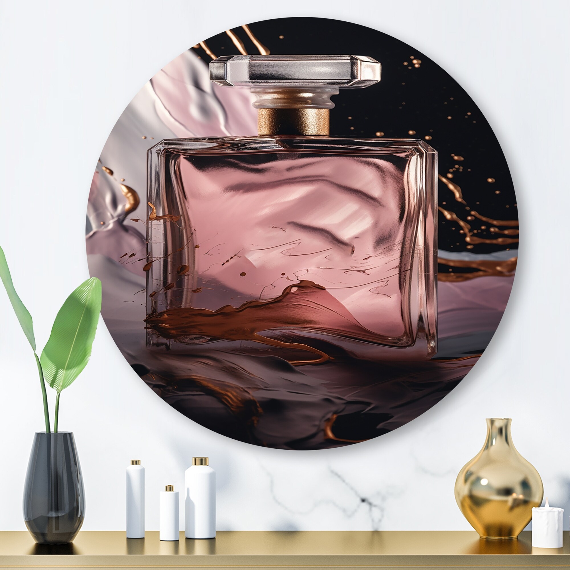 Designart "Gold Perfume Couture II" Fashion Perfume Metal Round Wall Art