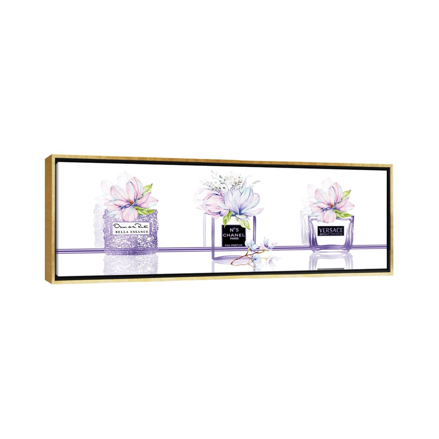 iCanvas "Perfume Obsession Set of 3 Purple Perfume Bottles With Pastel Magnolias" by Pomaikai Barron Framed Canvas Print