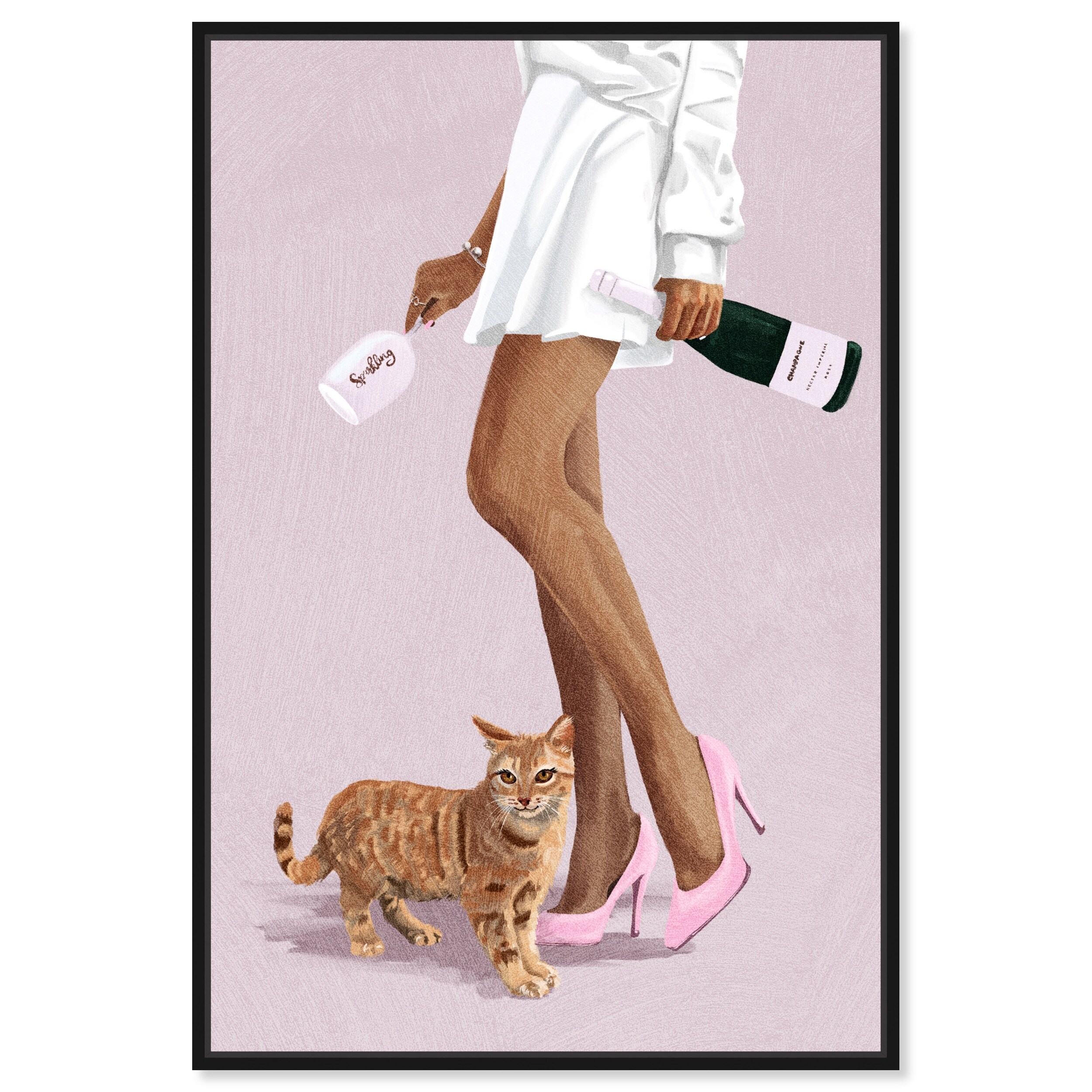 "Champagne and Pet", Champagne Woman and Cat Glam White Framed Canvas Wall Art Print for Dining Room