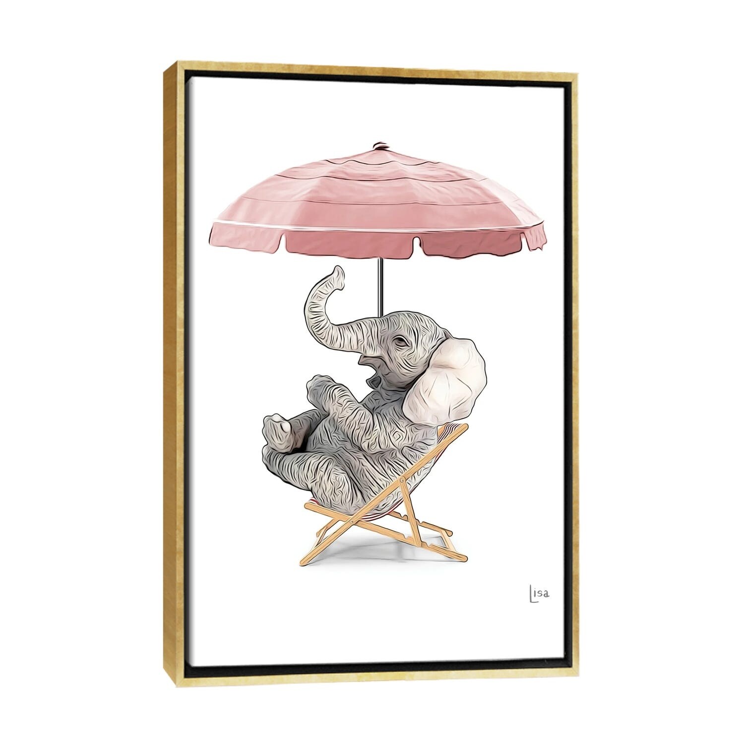 iCanvas "Elephant At the Beach on Deck Chair And Umbrella" by Printable Lisa's Pets Framed