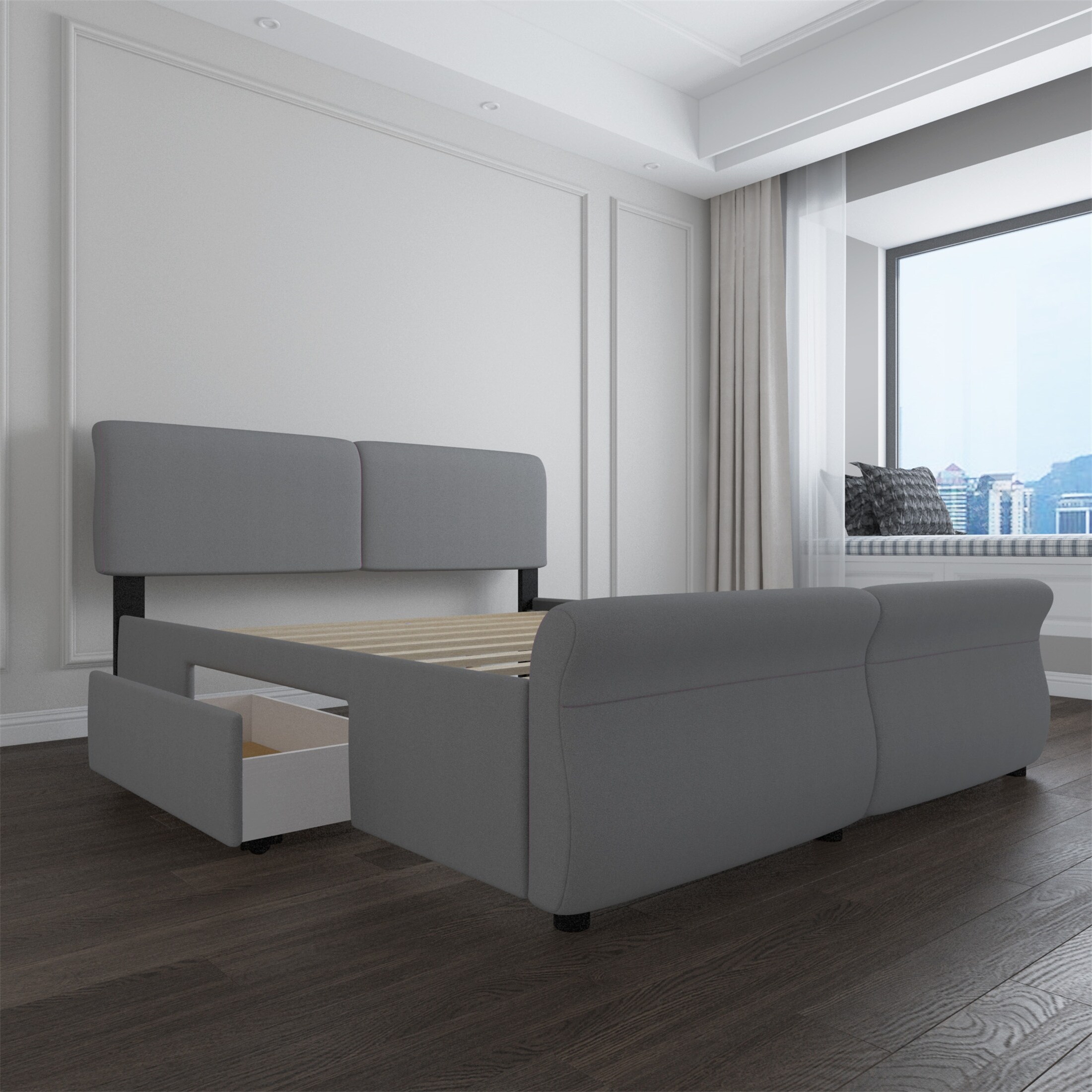 Gray Queen Size Upholstery Platform Bed with Two Drawers
