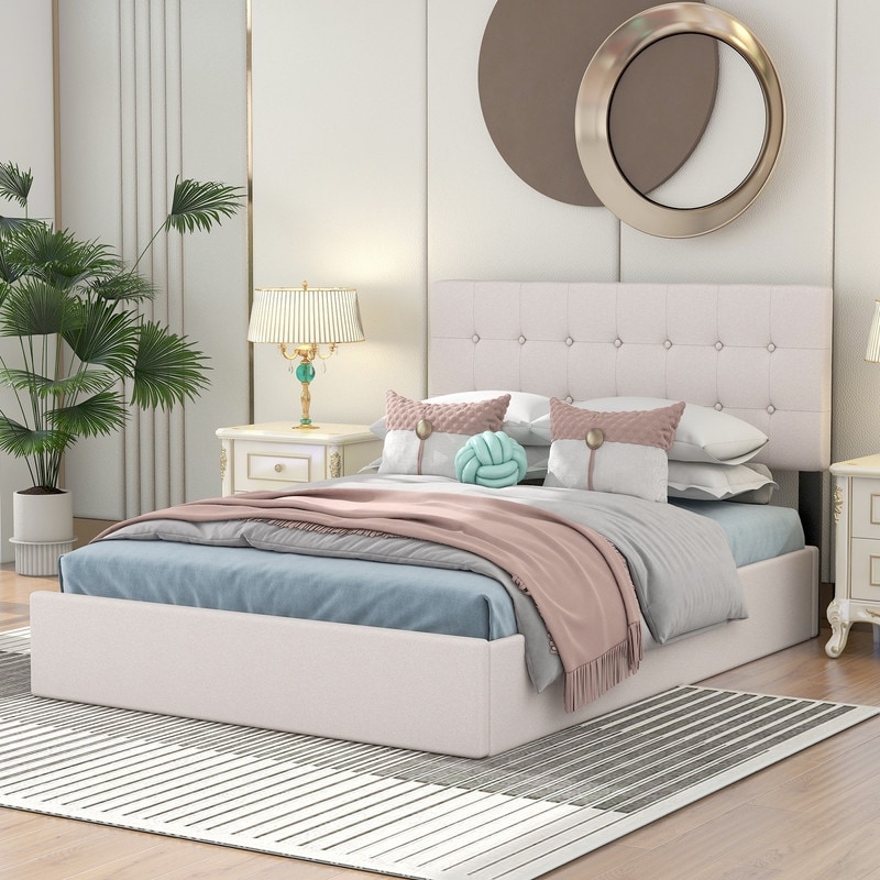Queen Size Upholstered Linen Platform bed with a Hydraulic Storage System