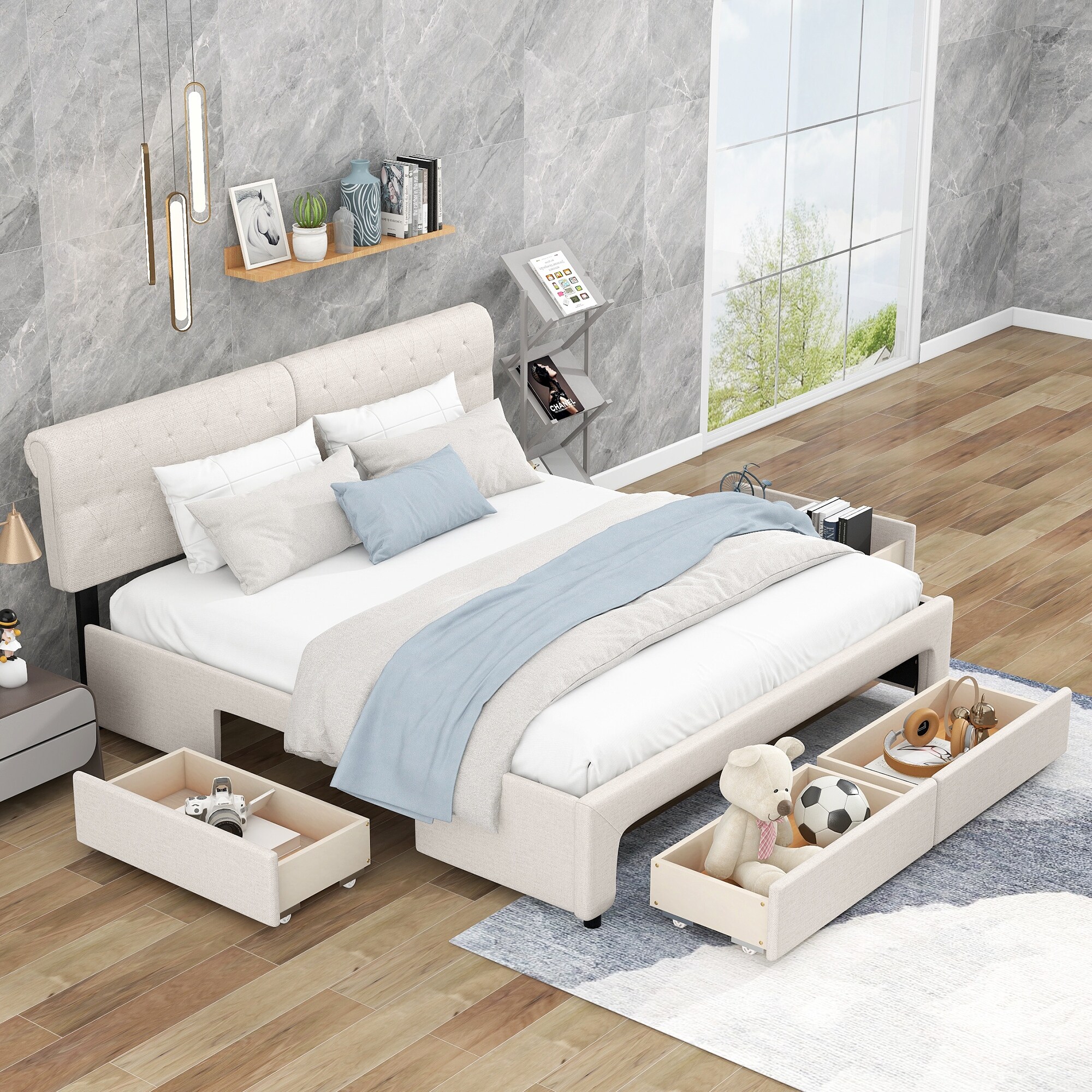 Queen Size Upholstered Storage Platform Bed with Tufted Headboard&4 Drawers