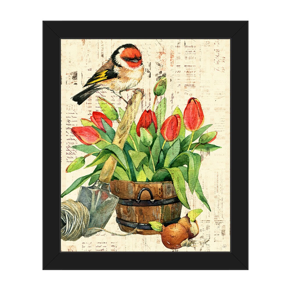 'Garden Bird and Red Tulips' Framed Canvas Wall Art