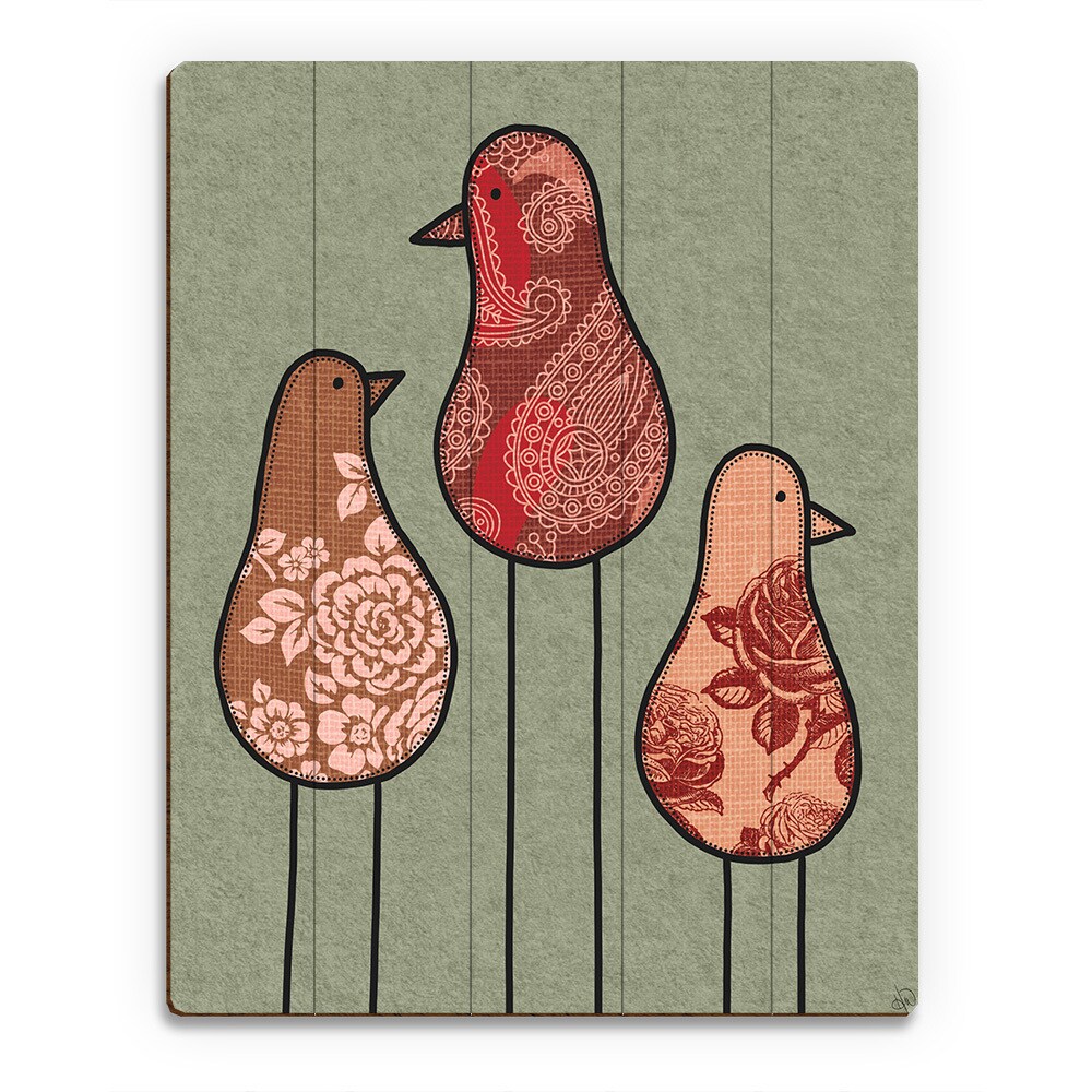 Patchwork Birds Red Wood Wall Art Print