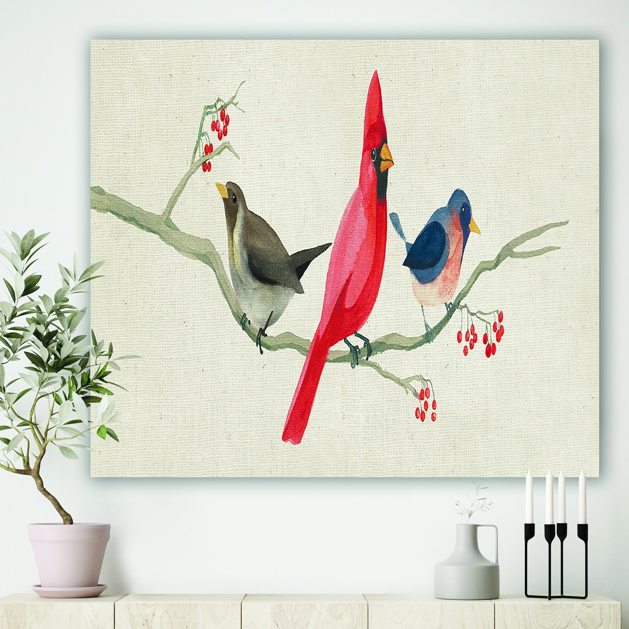 iCanvas "Birds On Wire - Red Cardinal, Chickadee, Goldfinch, Bluebird" by Nataly Mak 3-Piece Canvas Wall Art Set