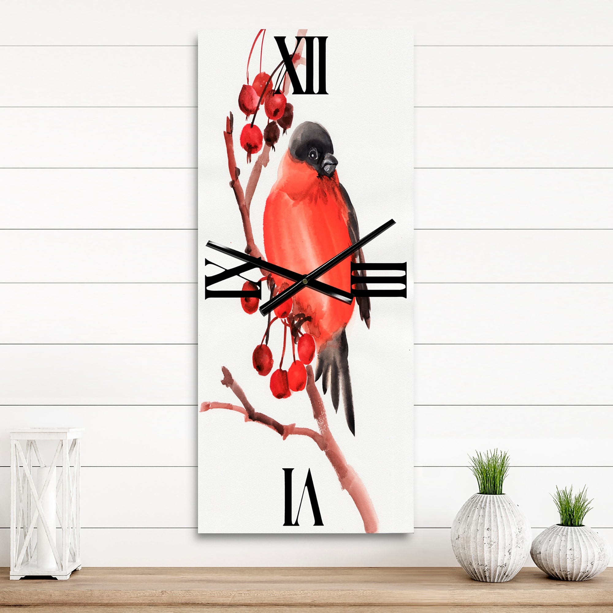 Designart 'Red Bullfinch Bird on A Branch With Berries' Traditional Metal Wall Clock