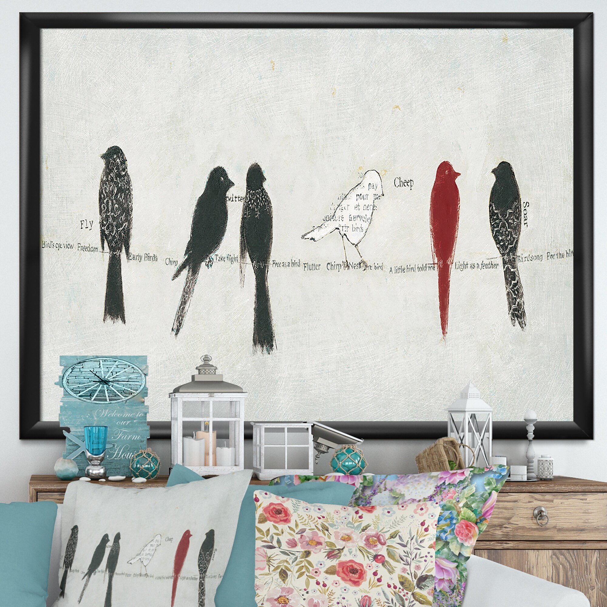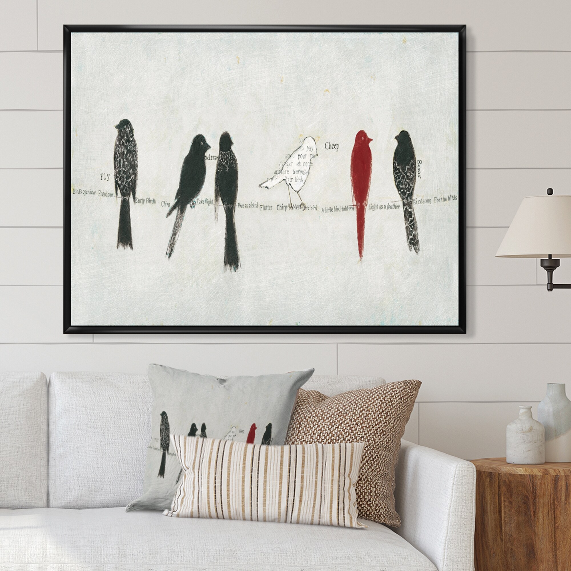 Designart "Red Catching Up Bird Family" Farmhouse Framed Art Print