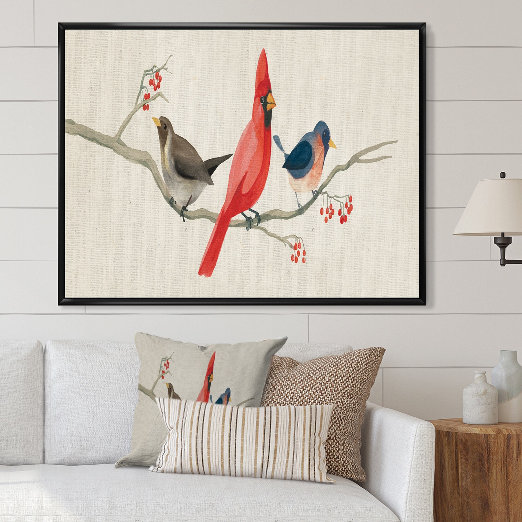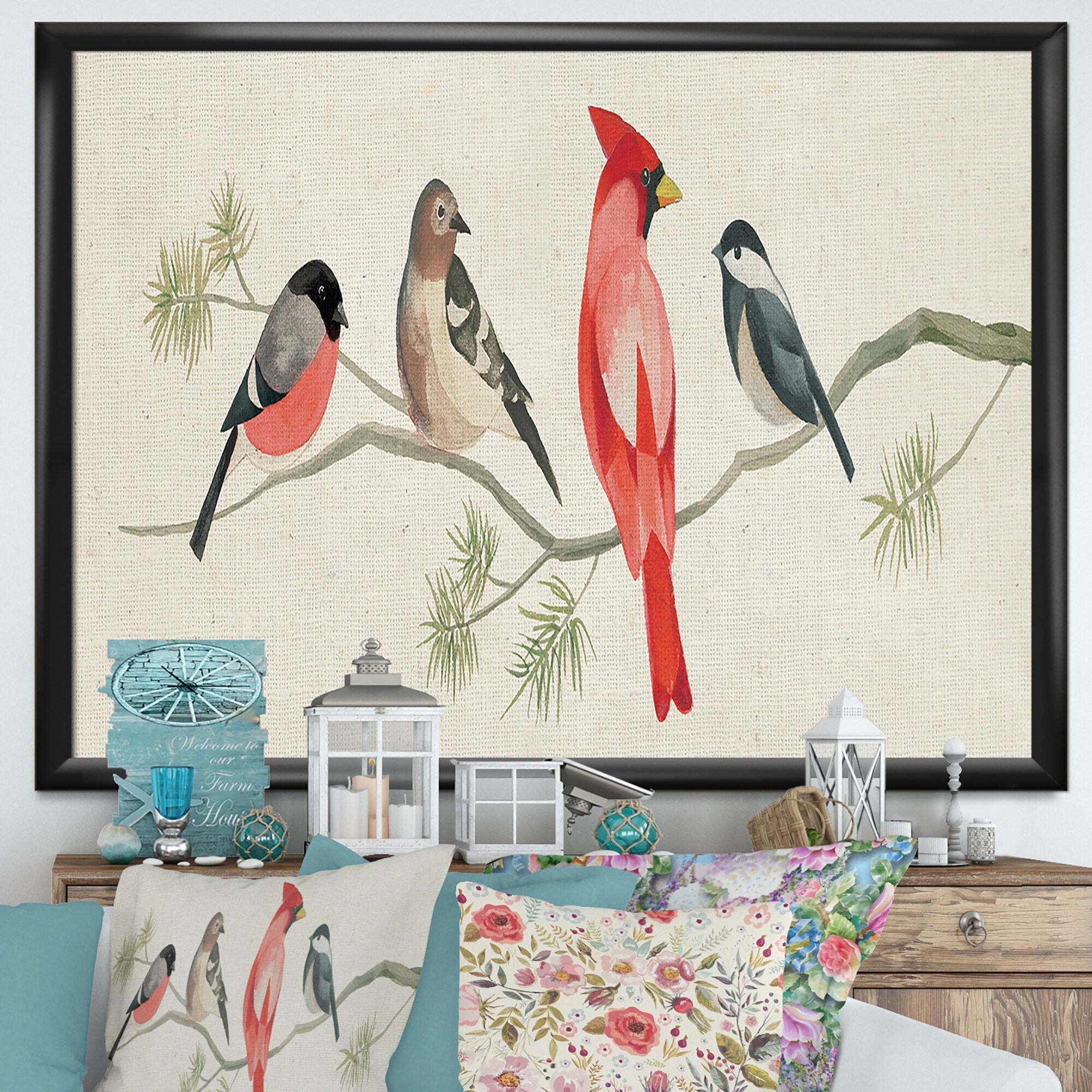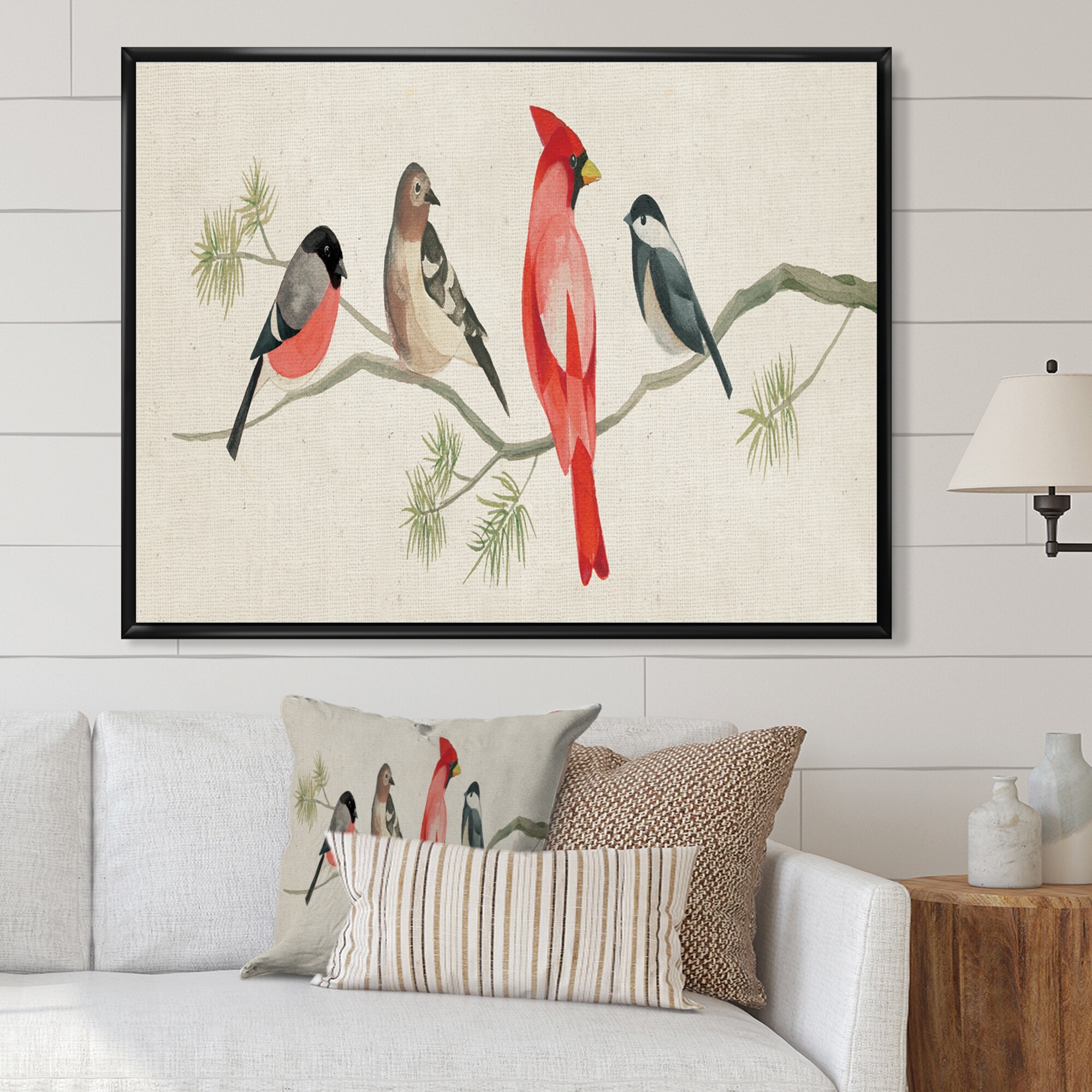 Porch & Den "Chickadee and Red Farmhouse Bird on Branch" Framed Art Print