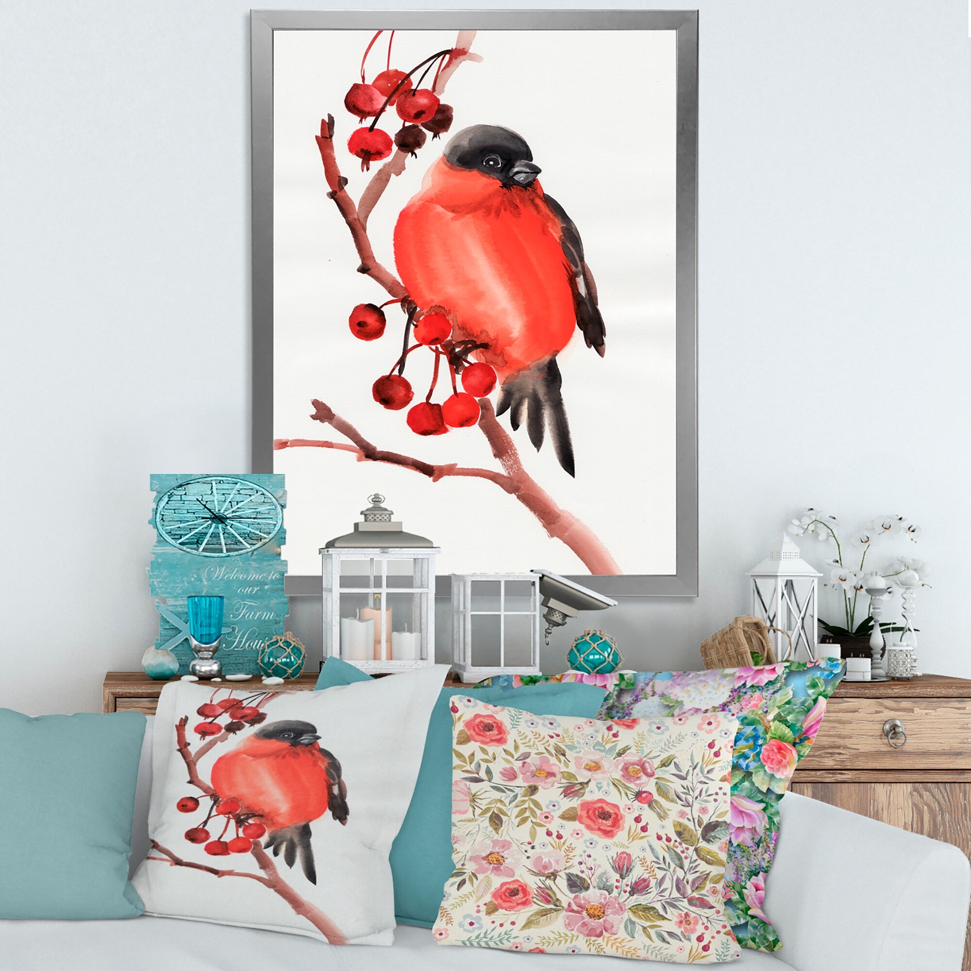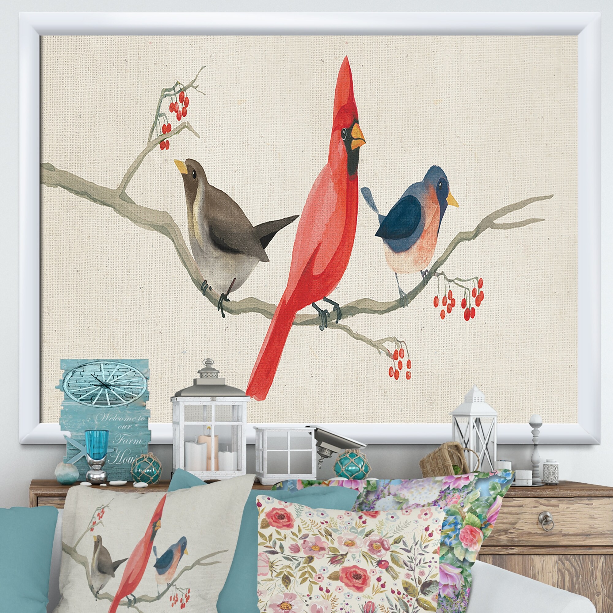 Designart "Red Farmhouse Bird on Branch " Modern Farmhouse Framed Art Print