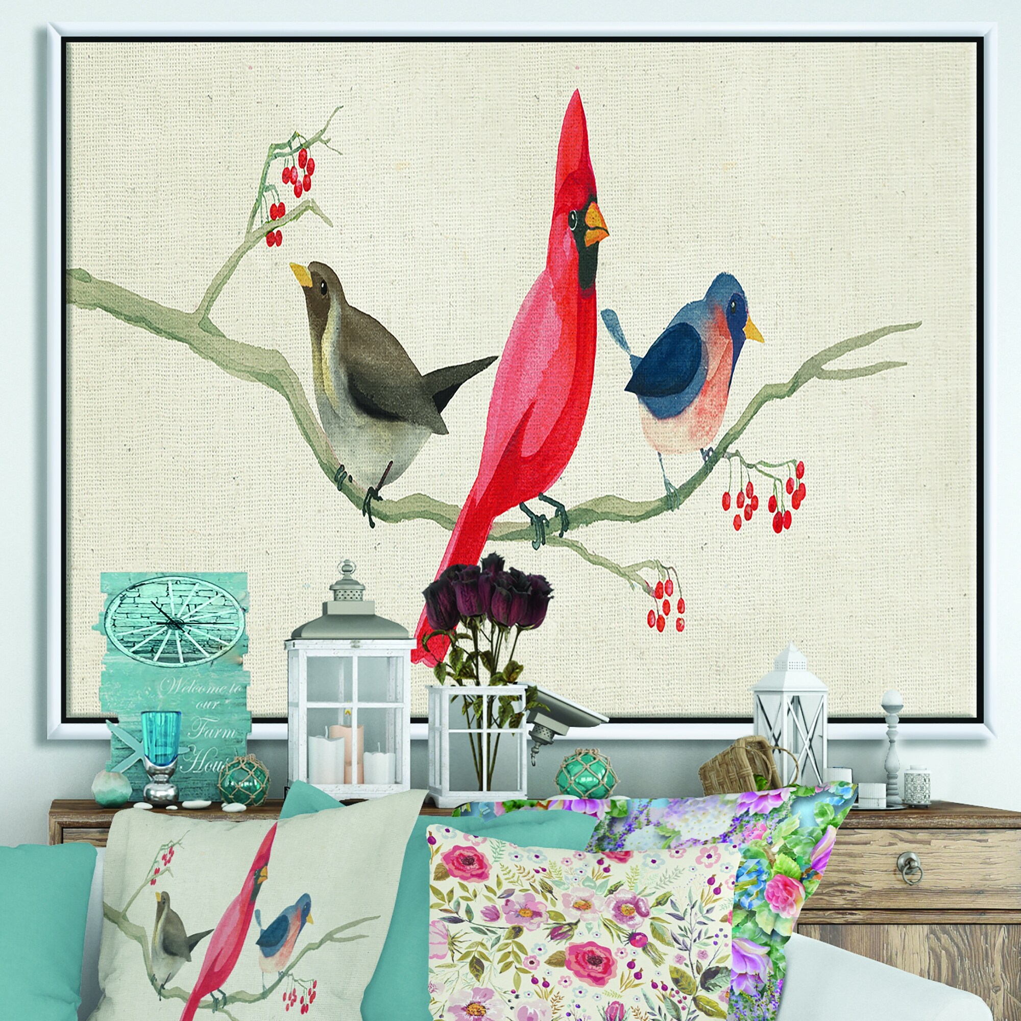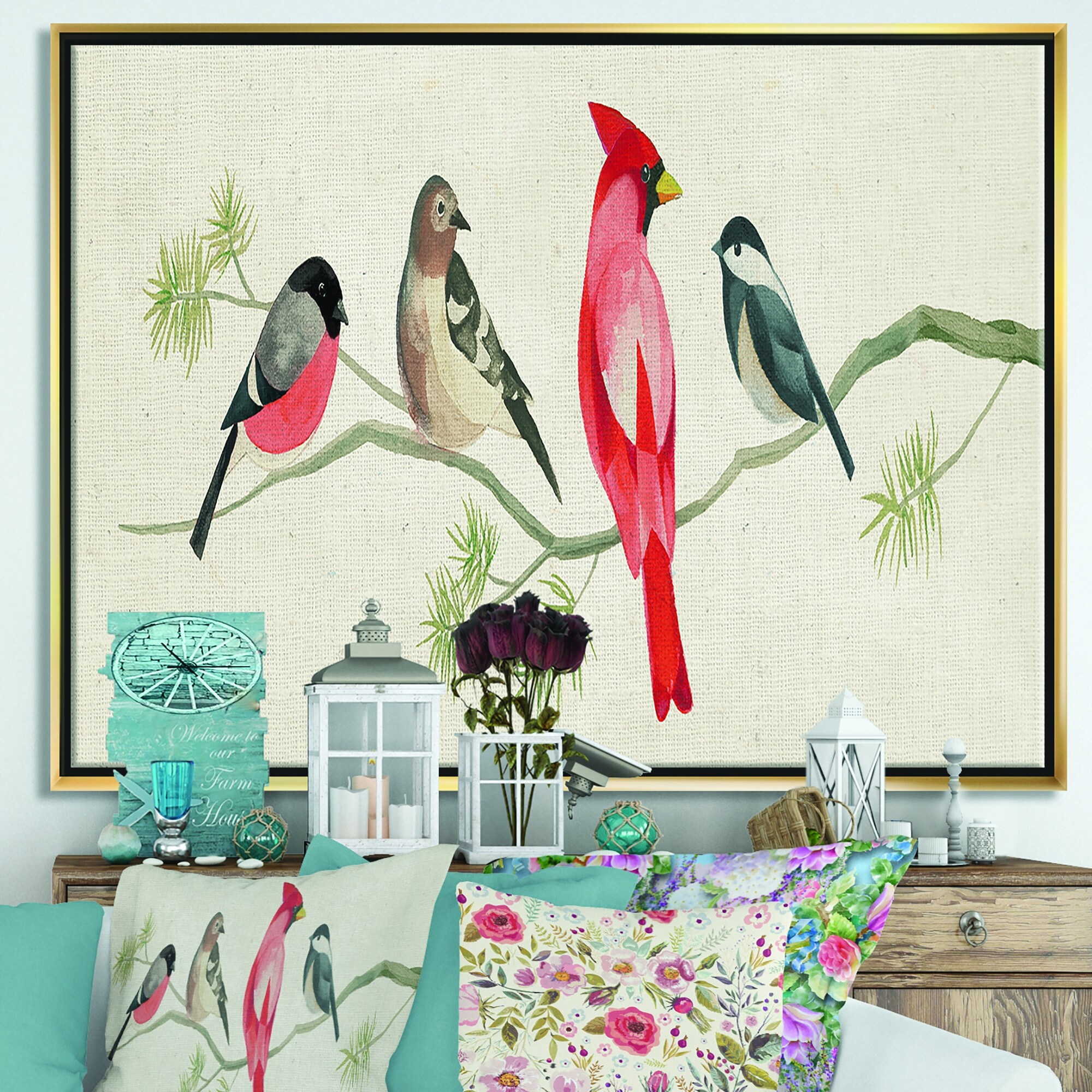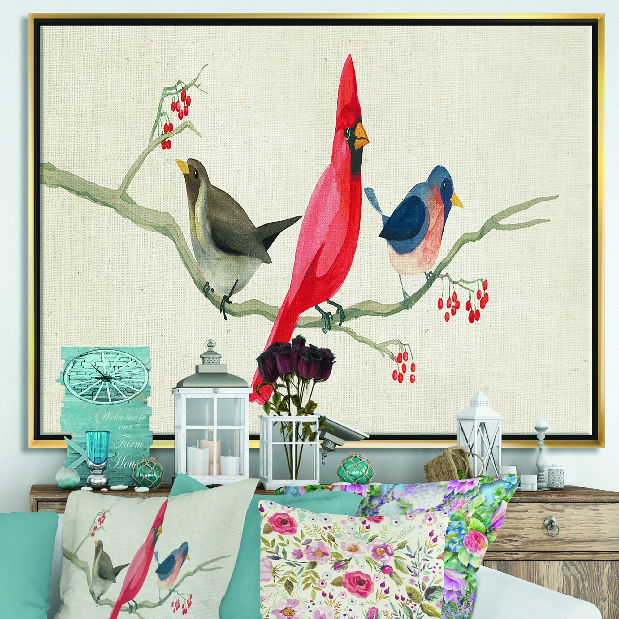 Designart "Red Catching Up Bird Family" Farmhouse Framed Canvas