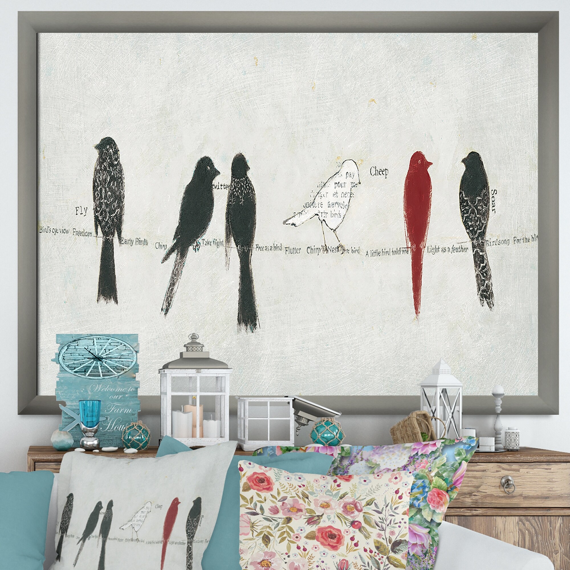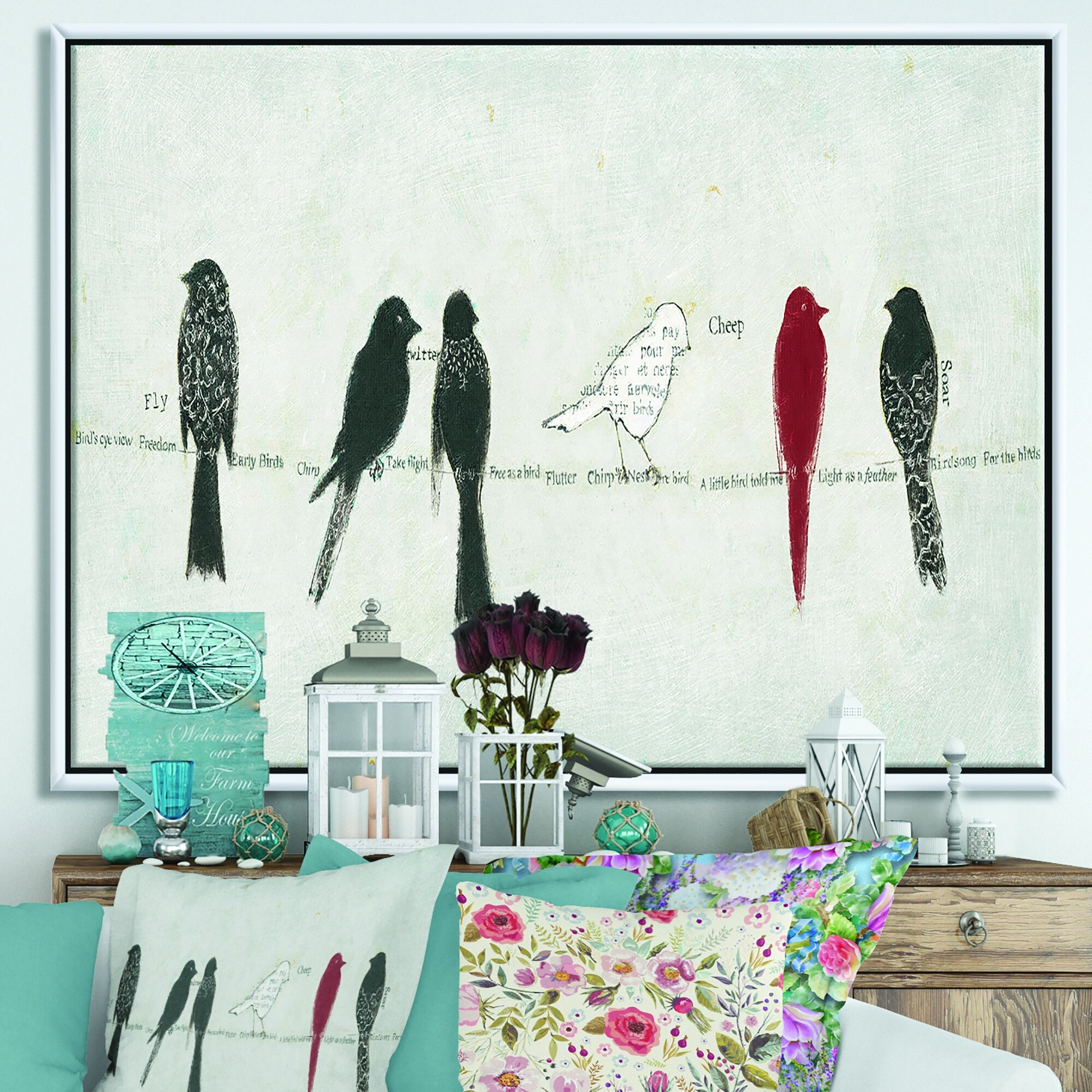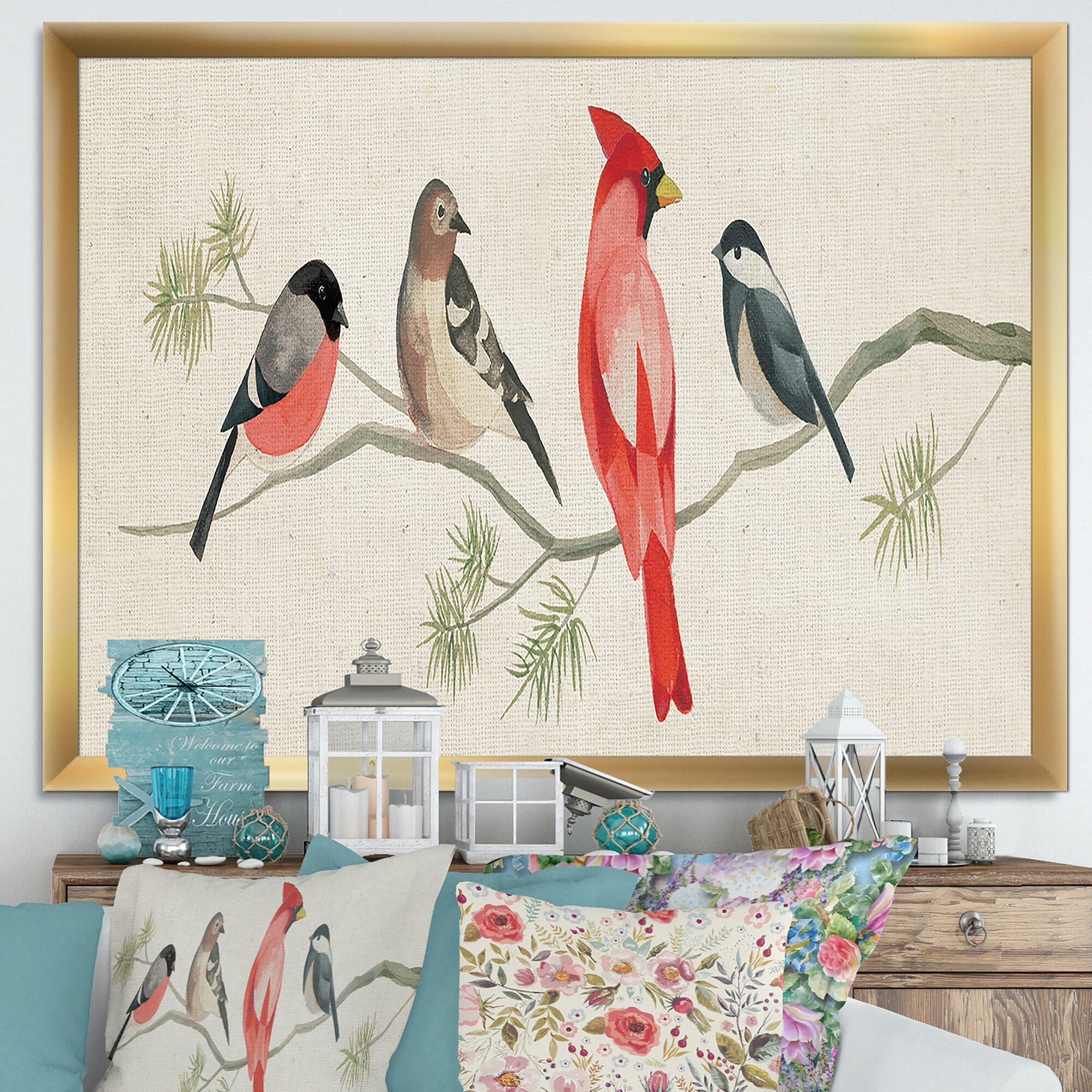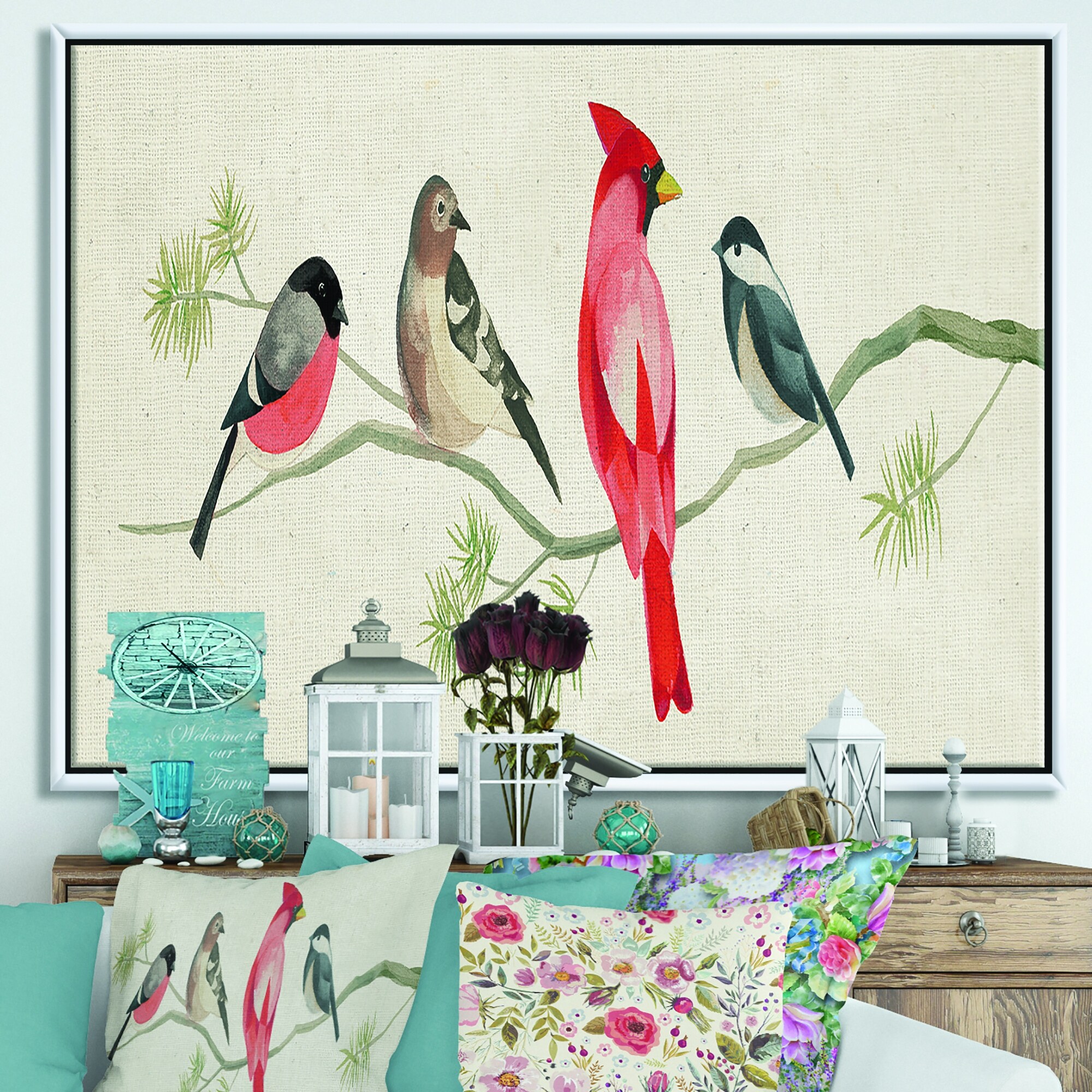 Designart "Red Catching Up Bird Family" Farmhouse Framed Canvas