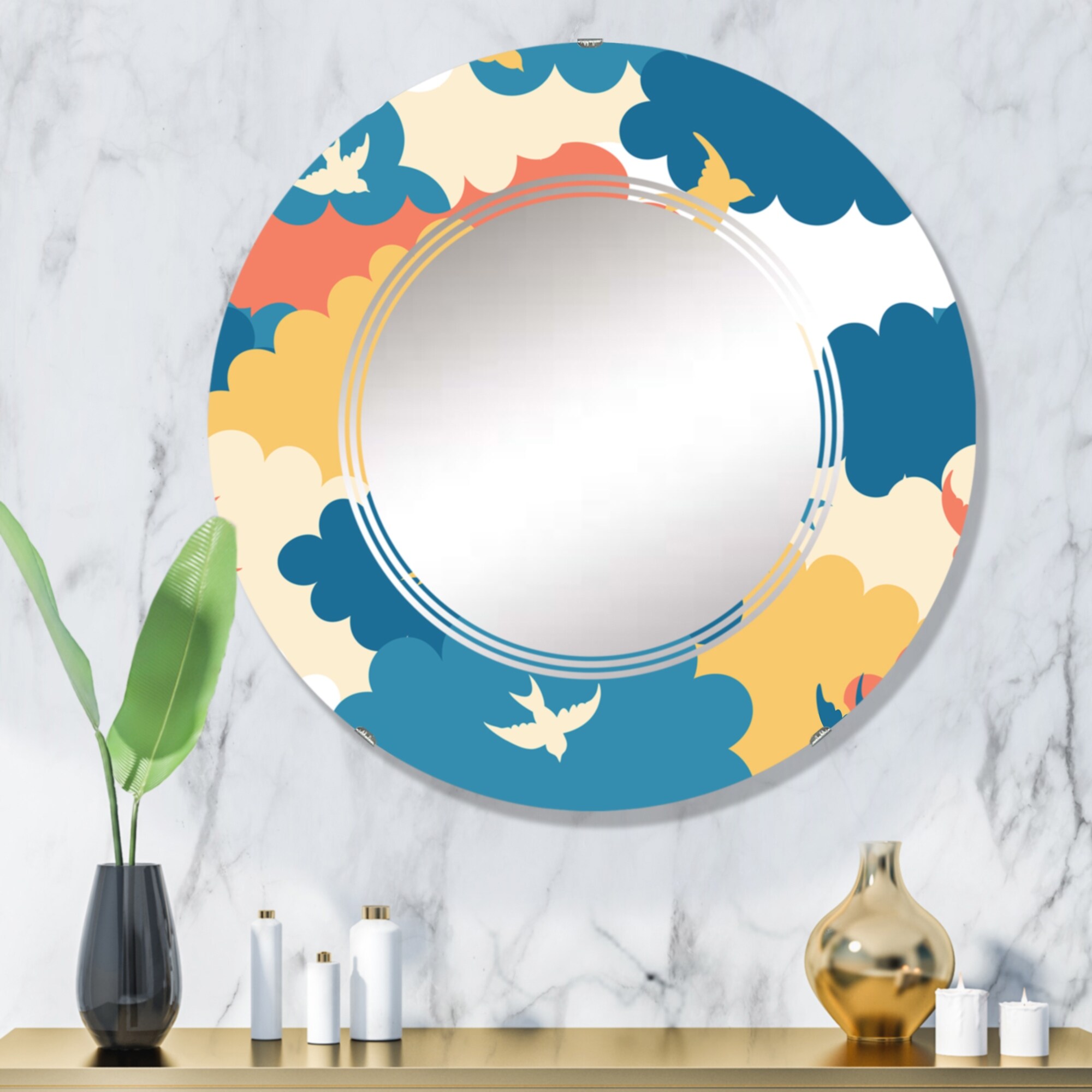 Designart 'Red Blue And Yellow Clouds With Little Birds' Printed Patterned Wall Mirror