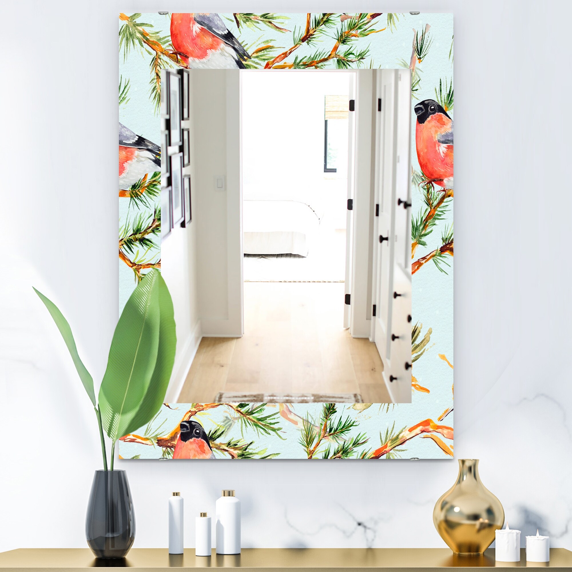 Designart 'Little Bird With Red Chest on Pine Branch' Traditional Mirror - Vanity Printed Mirror