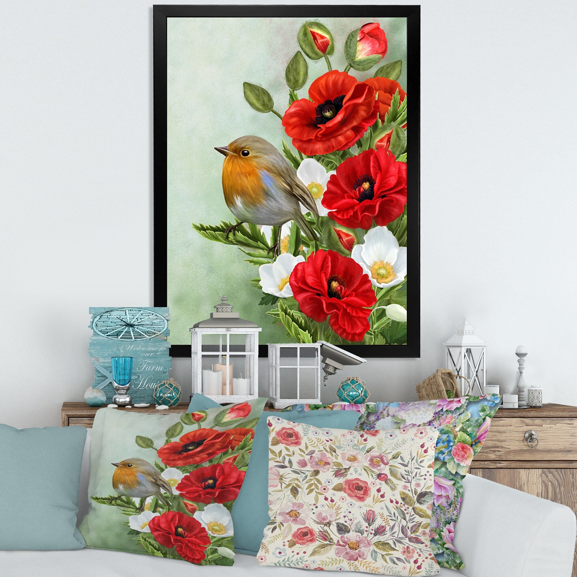 Designart "Yellow Bird With Red Poppies and White Anemones" Traditional Framed Art Print