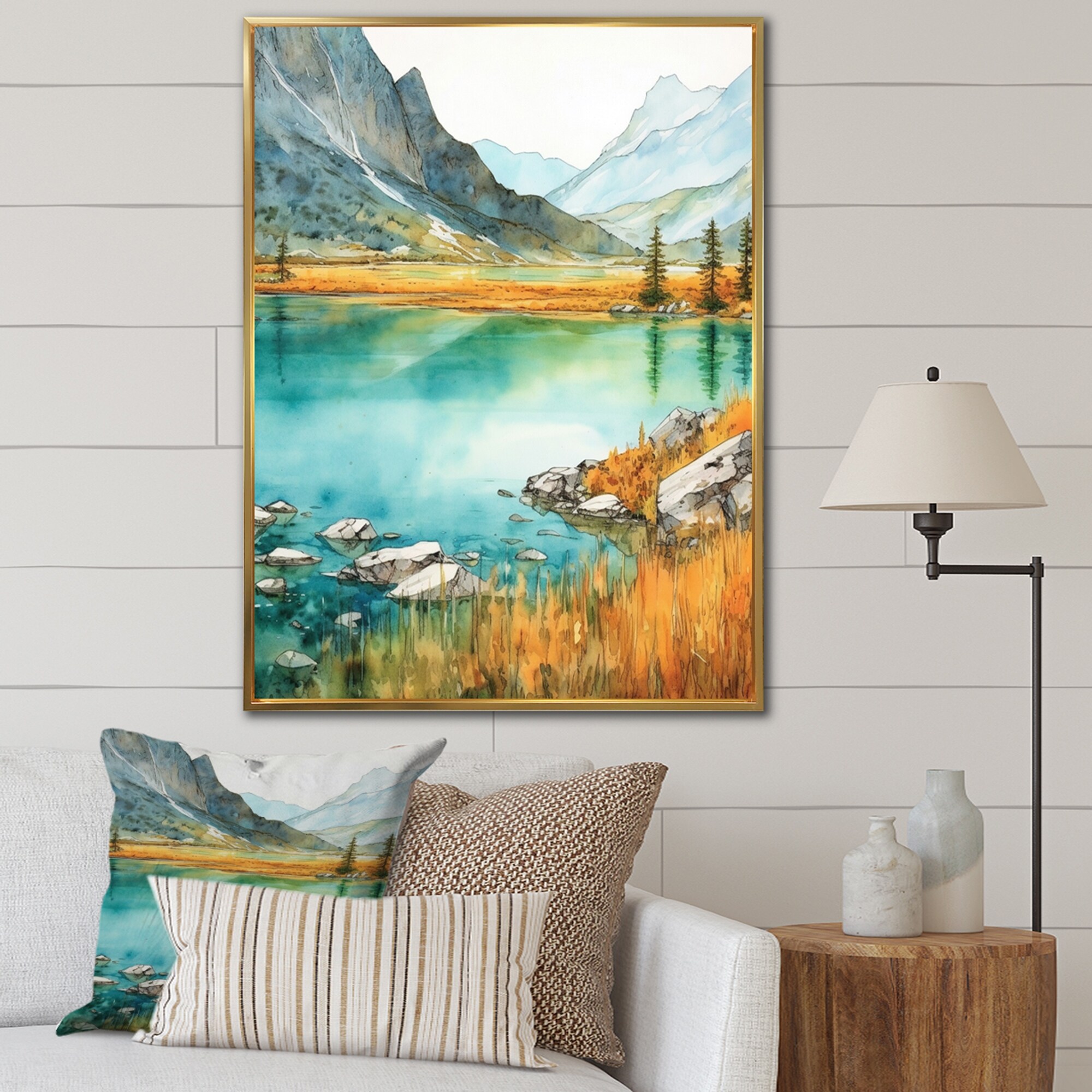 Designart "Calming Mountain Riverside II" Landscape Mountains Framed Canvas Art Print