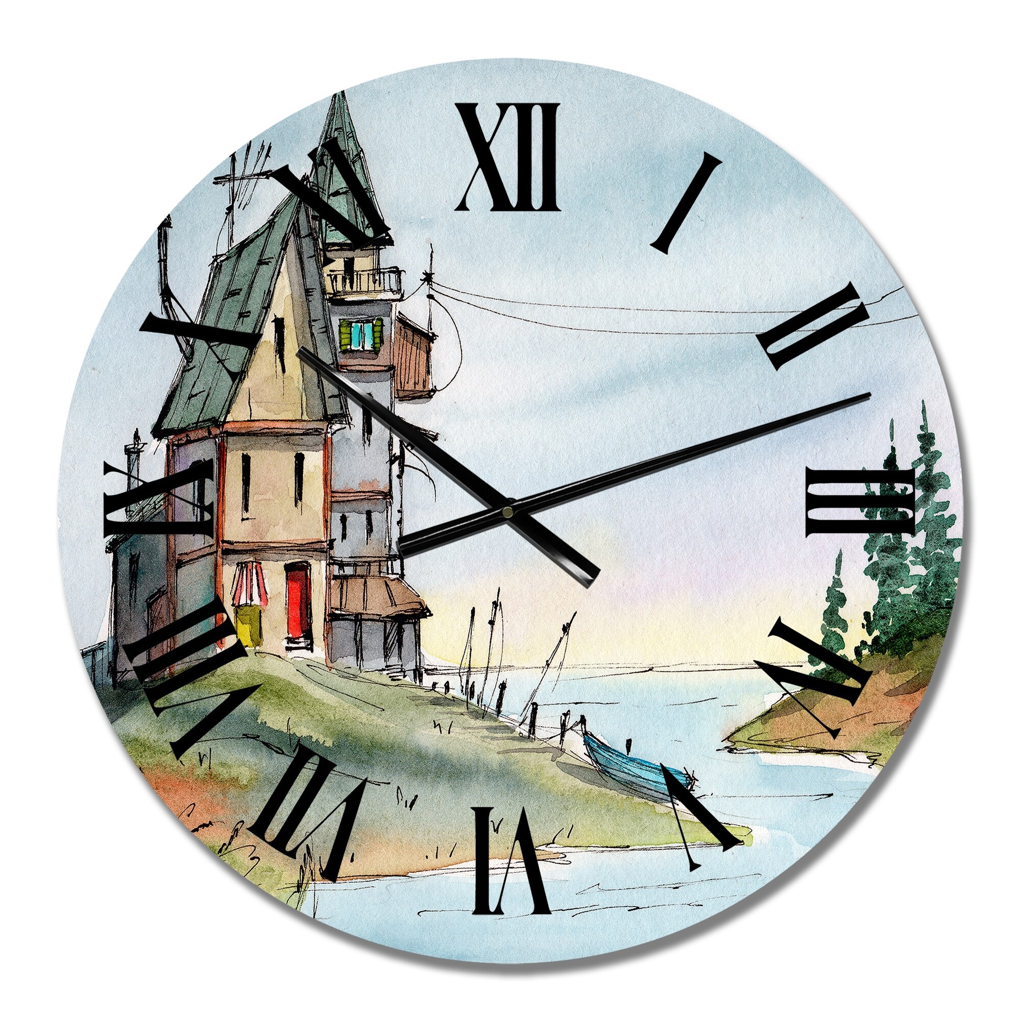 Designart 'Colorful Old House With A Tower By the Riverside' Nautical & Coastal wall clock