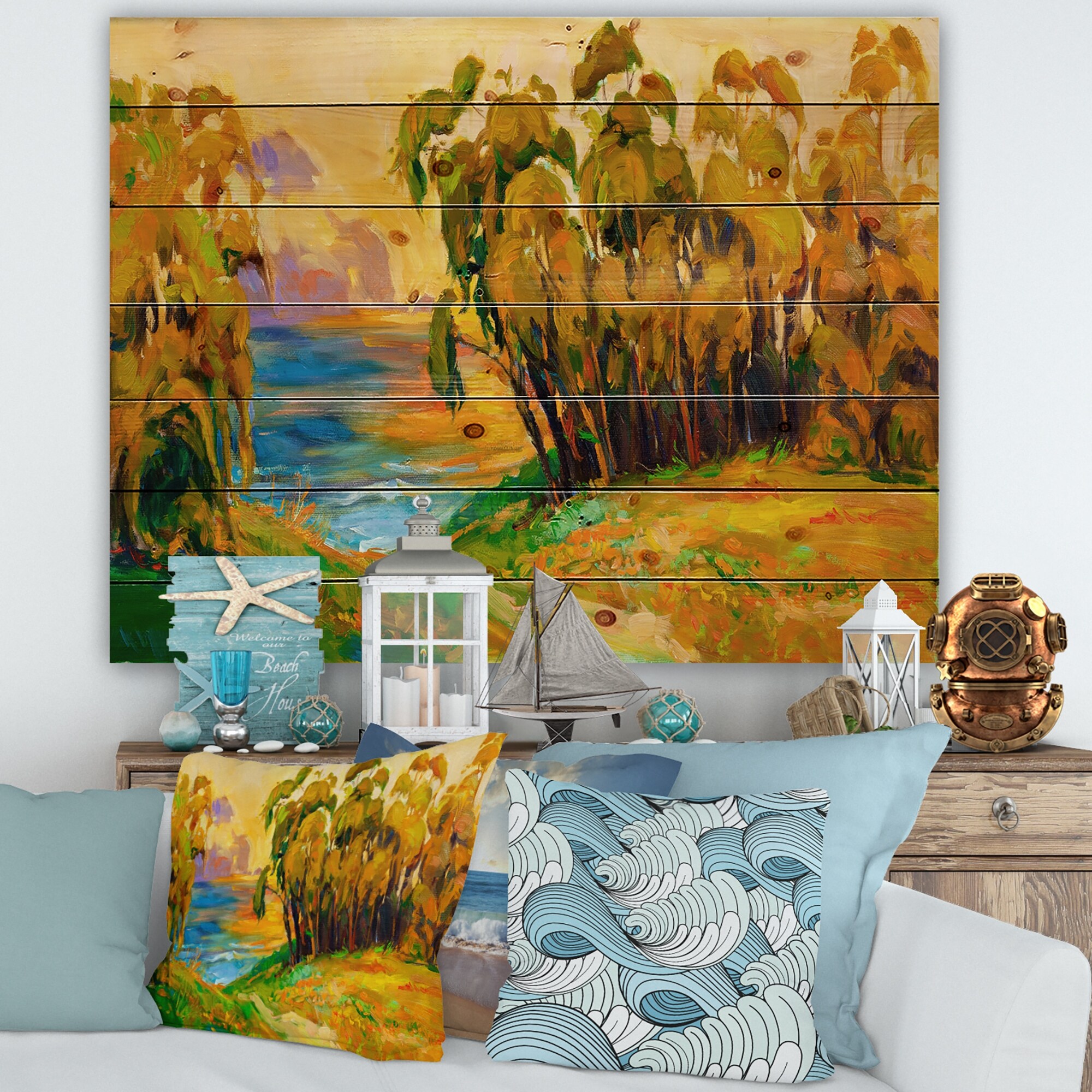 Designart 'Yellow Birches By the Riverside II' Landscape Forest Wood Wall Art - Natural Pine Wood