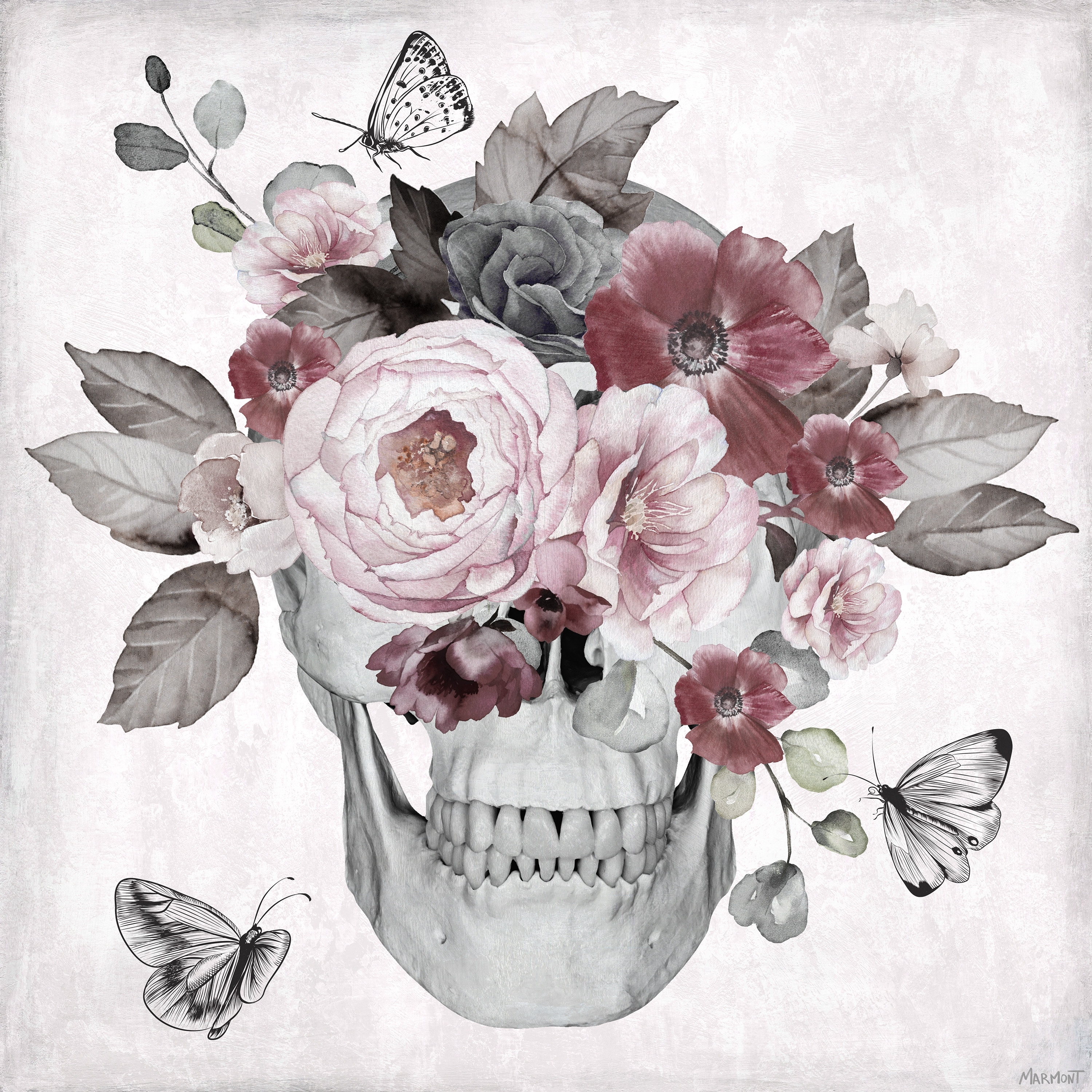'Skull and Pink Peonies' Painting Print on Wrapped Canvas