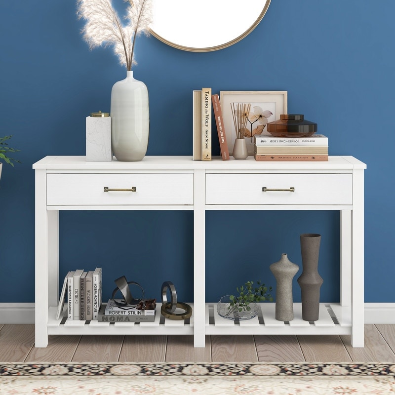 Classic Solid Console Table with 2 Drawers & Slatted Shelf (White)