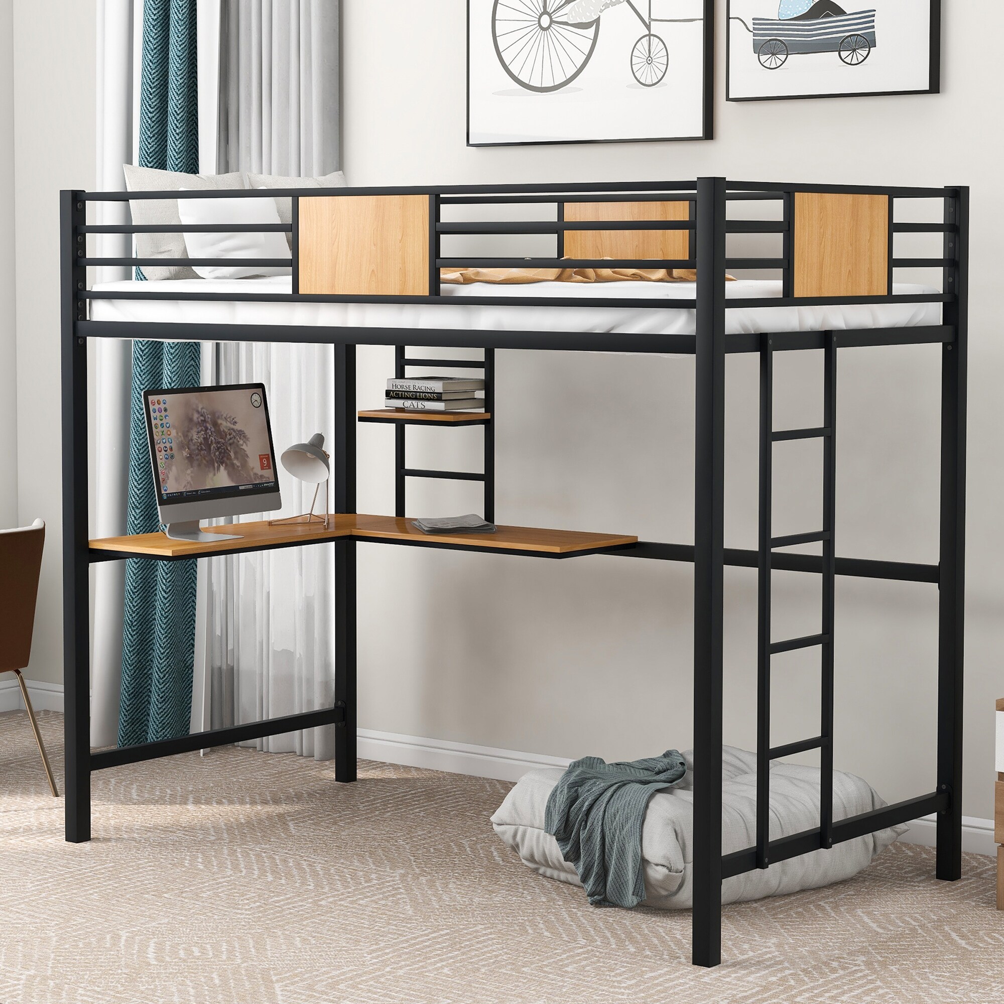 Twin Size Metal Loft Bed with Desk and Shelve, with Horizontal Slatted Headboard and Footboard