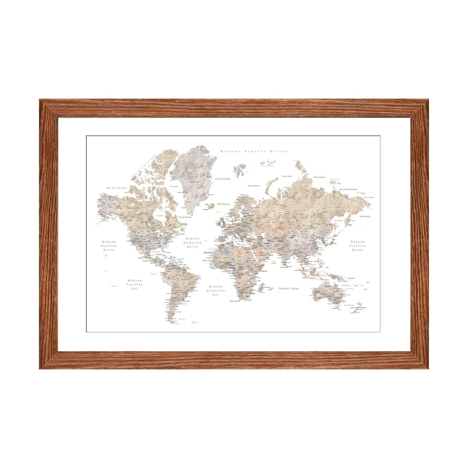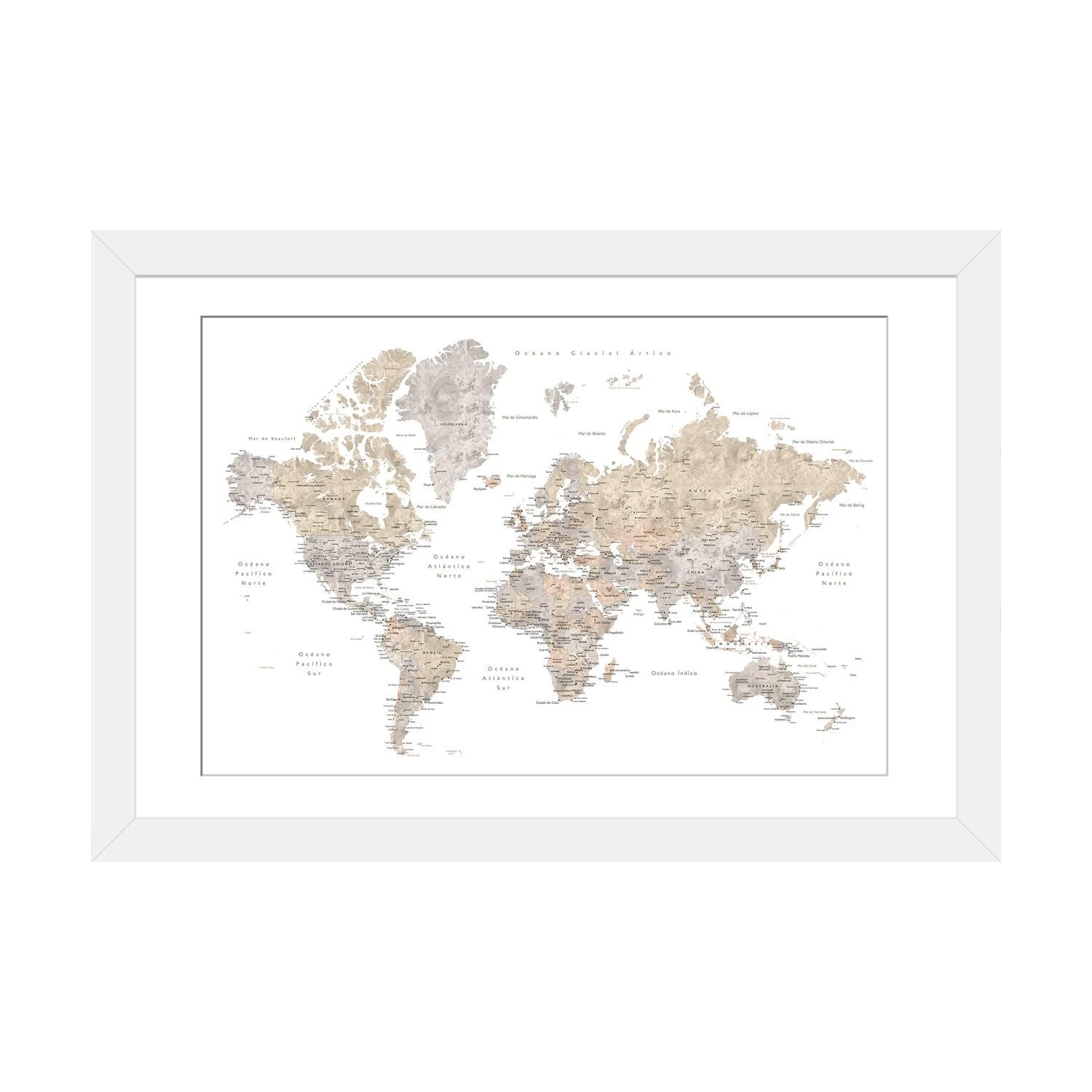 iCanvas "Neutral Watercolor World Map With Labels in Spanish" by blursbyai