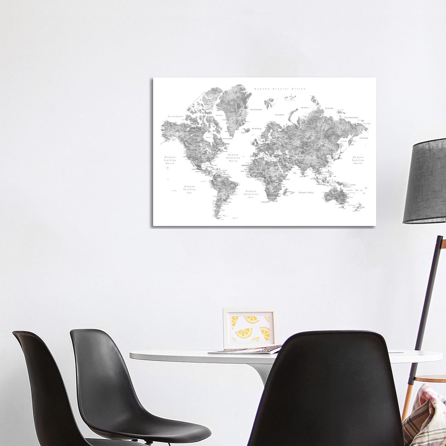 iCanvas "Gray Watercolor World Map With Labels in Spanish" by blursbyai Canvas Print