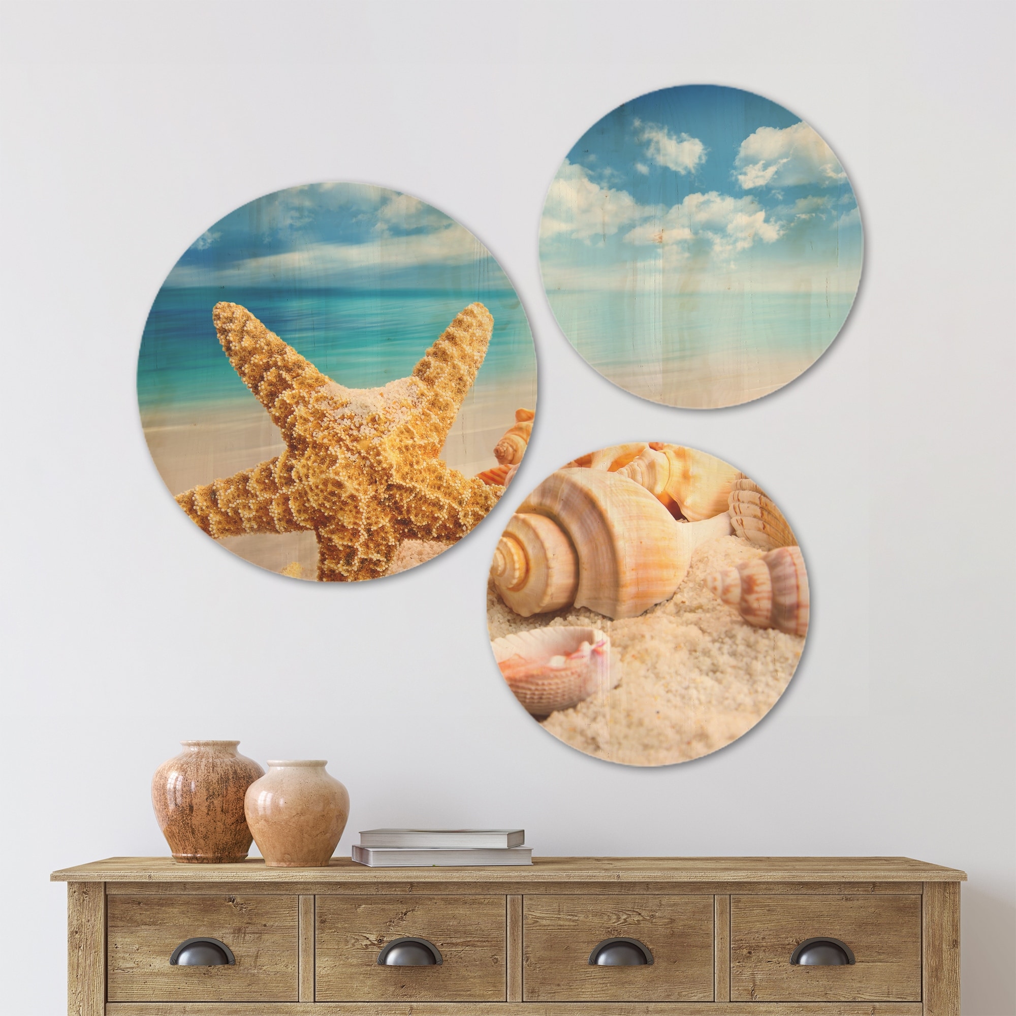 Designart 'Starfish and Seashells on Beach' Seashore Wood Wall Art Set of 3 Circles