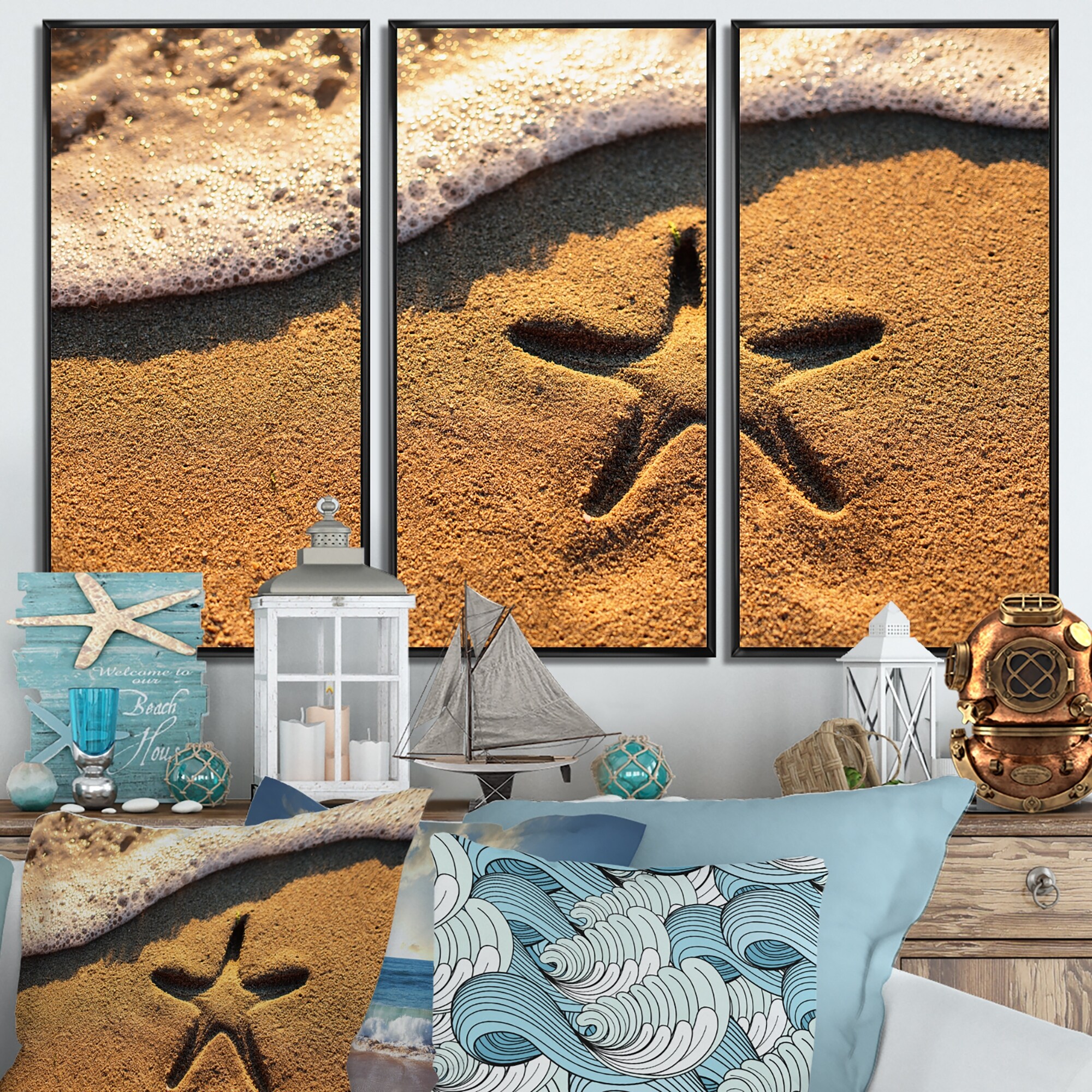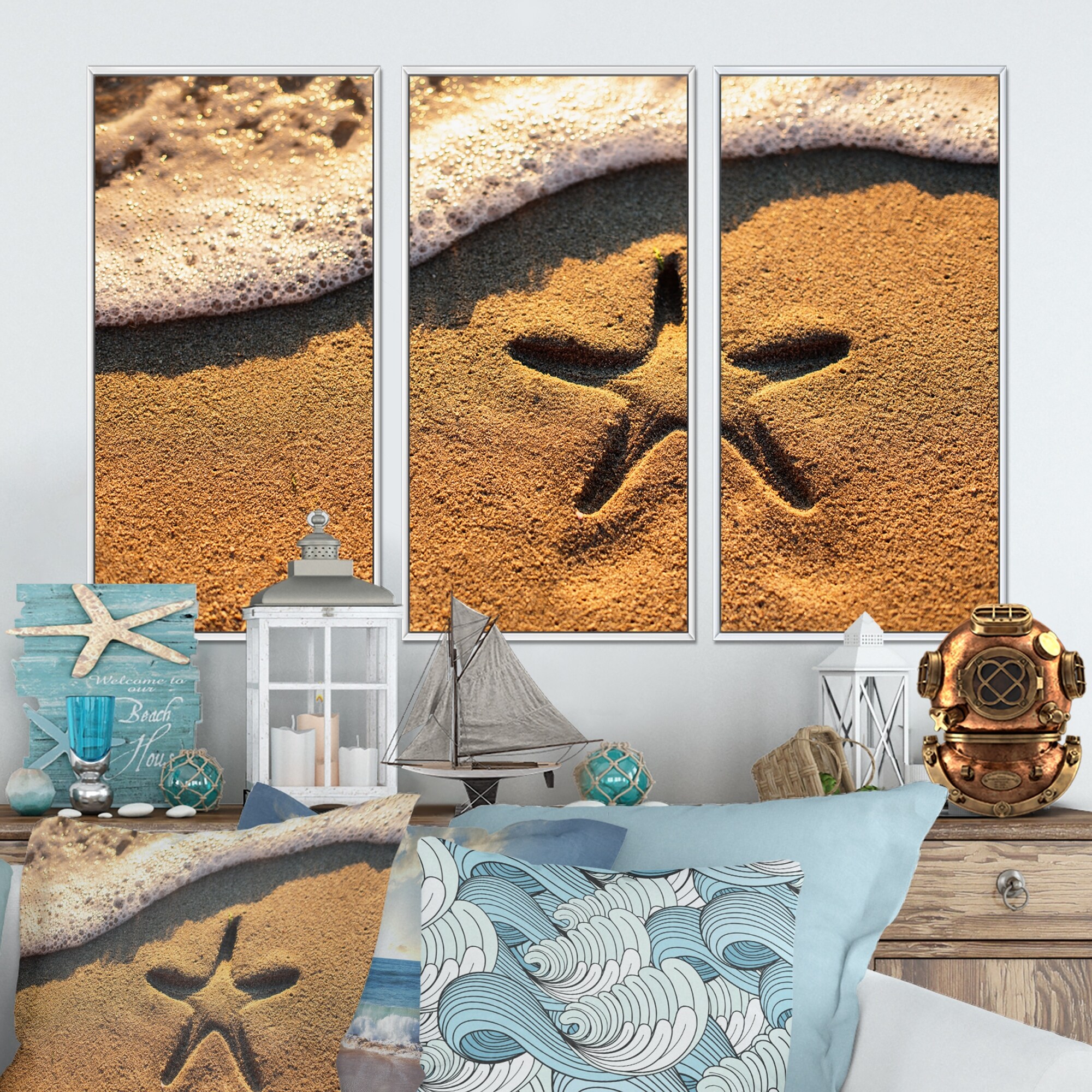 Designart "Starfish on Beach with Waves" Sea & Shore Framed Art Set of 3 - 4 Colors of Frames