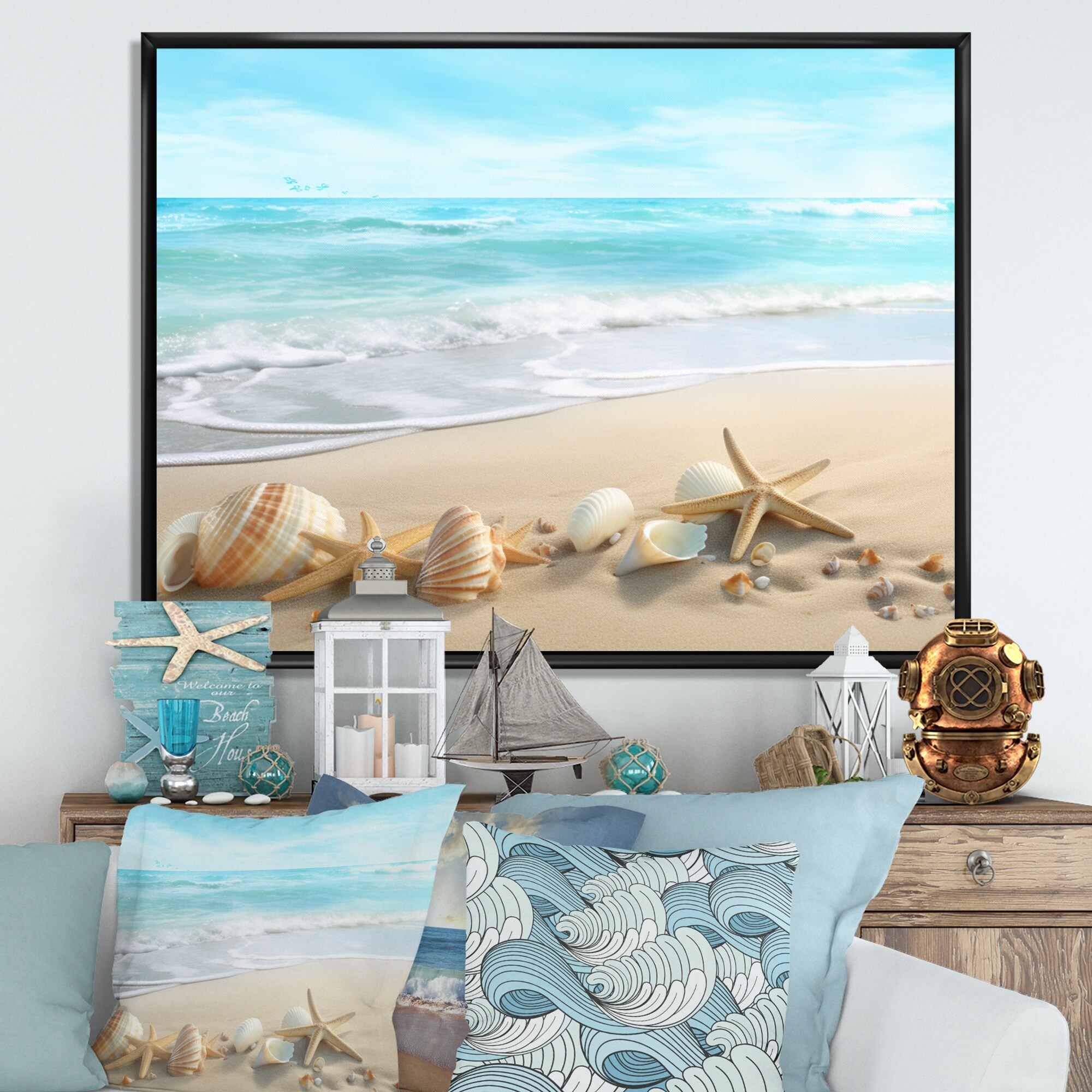 Designart "Starfish And Seashells V" Modern Landscape Beach Framed Canvas Prints