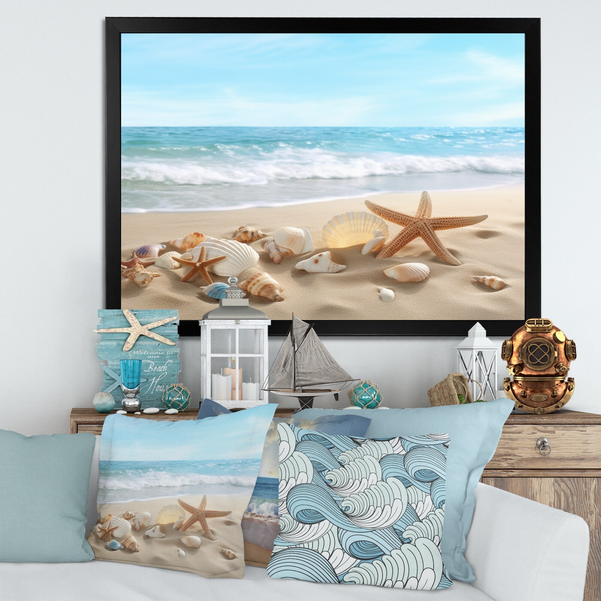 Designart "Starfish And Seashells Iii" Modern Landscape Beach Framed Wall Art Prints