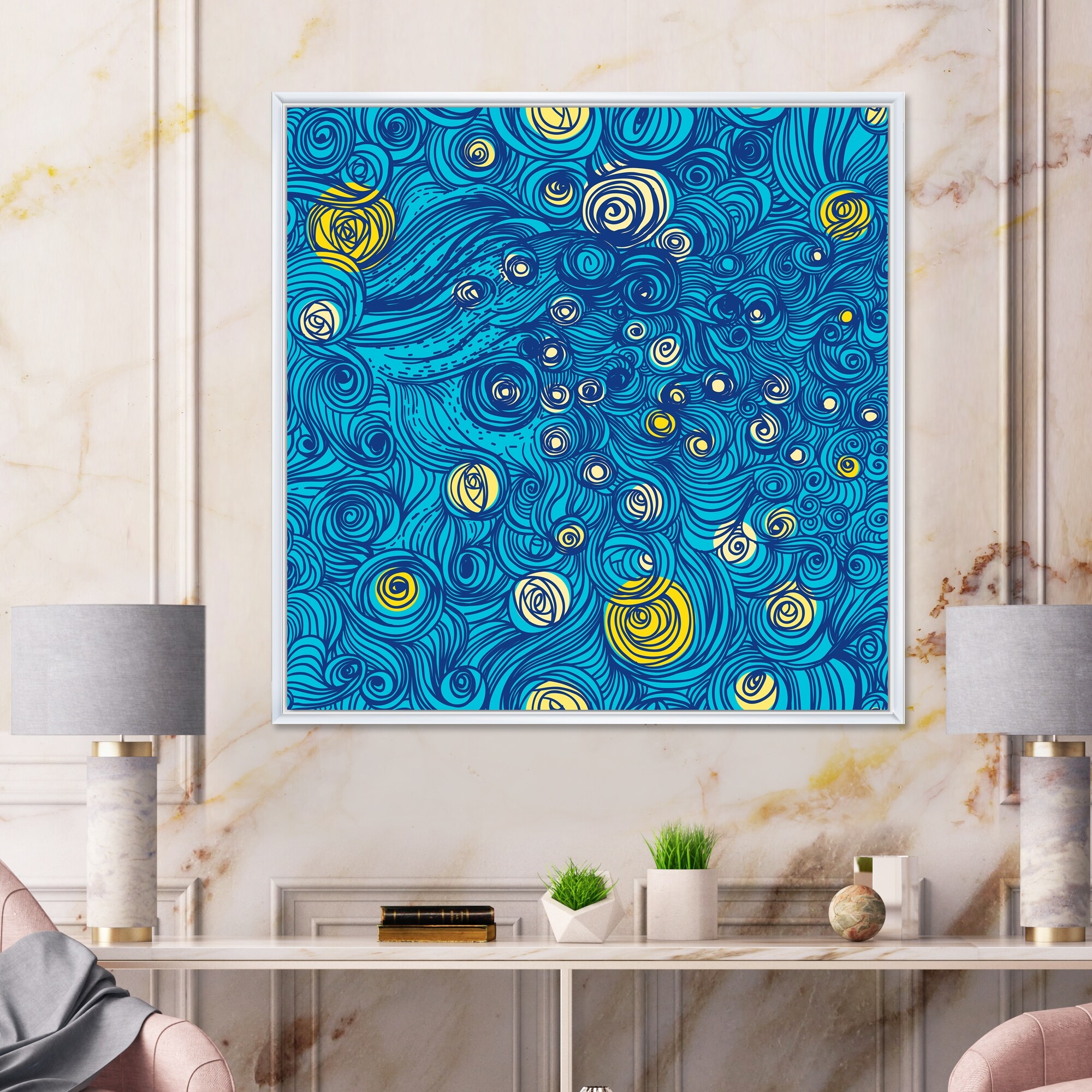 Designart "Starry Night Yellow And Blue" Modern Framed Canvas Wall Art Print