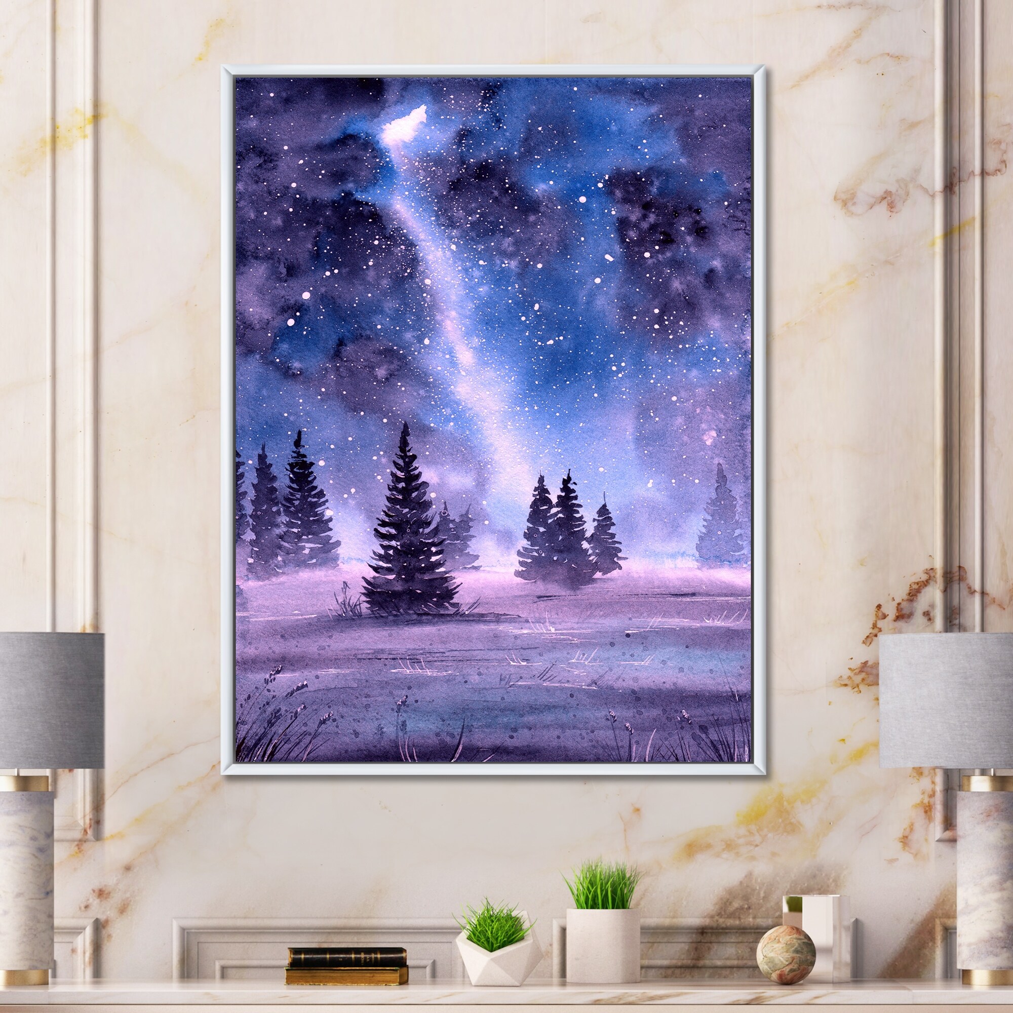 Designart "Starry Night Landscape With Fir Trees" Traditional Framed Canvas Wall Art Print