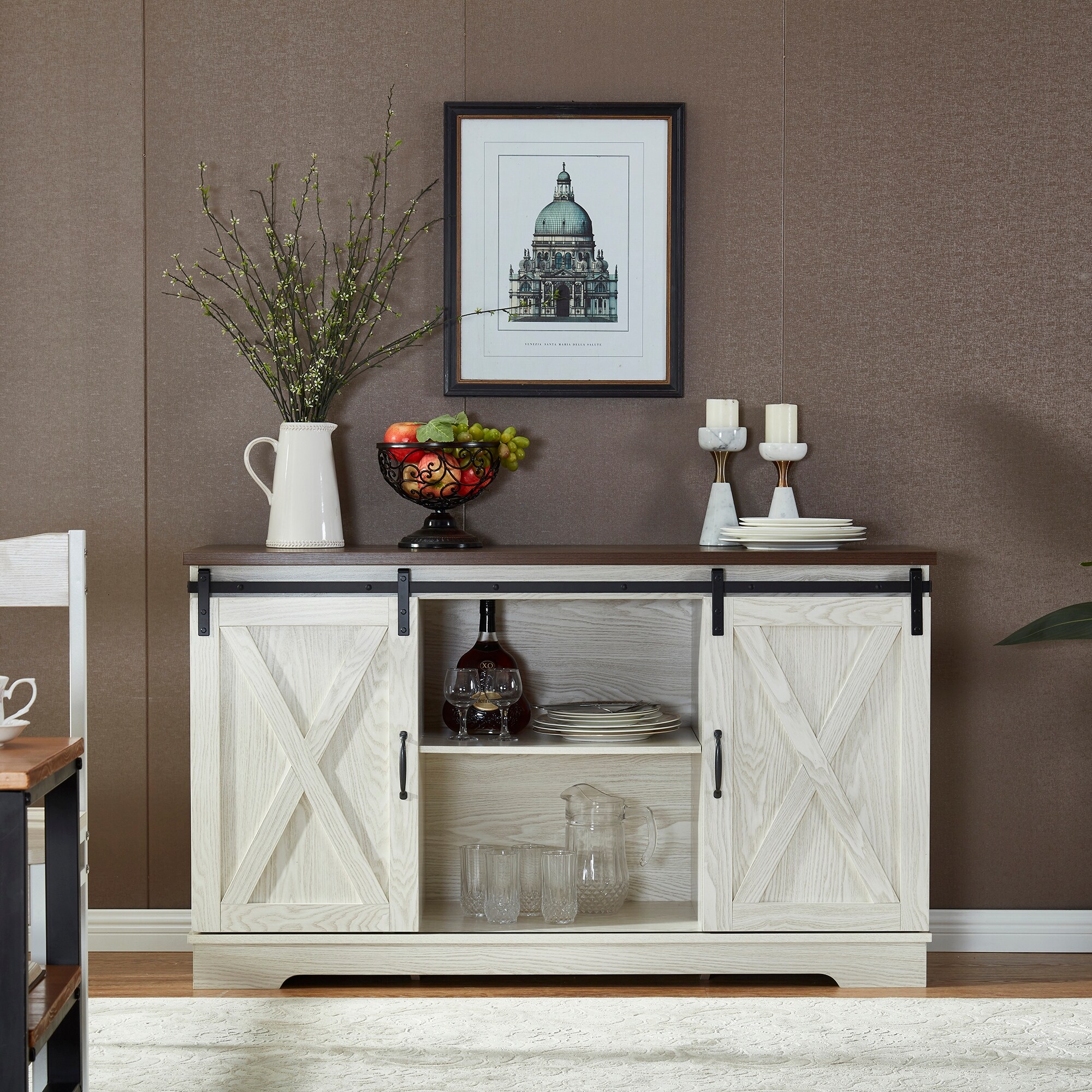 Modern Farmhouse TV Stand with Sliding Barn Doors, Adjustable Shelves, Large Storage