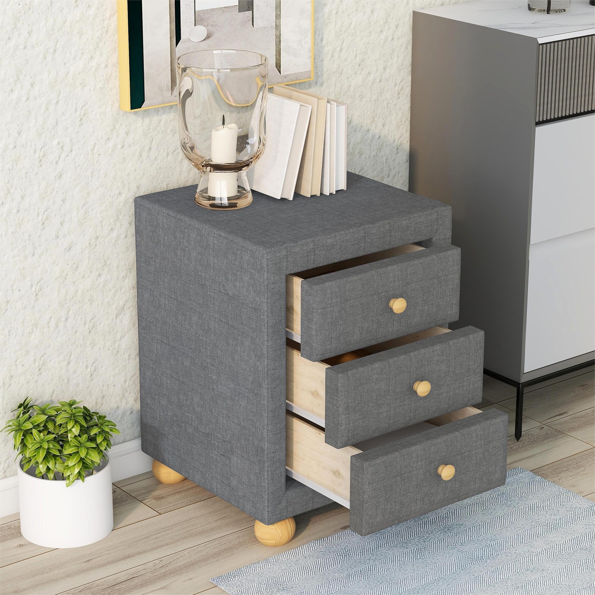 Modern Upholstered Storage Nightstand with 3 Drawers and Natural Wood Knobs, Dark Gray
