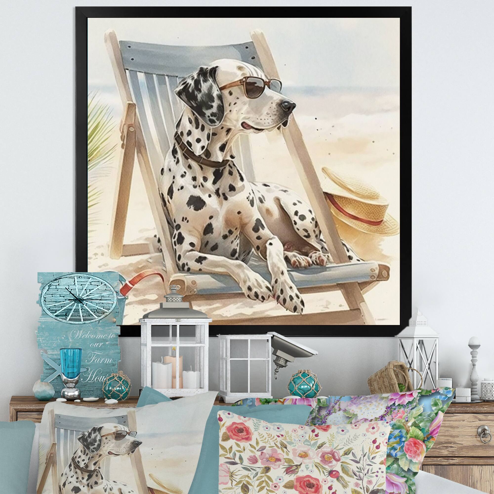 Designart "Dog Lounging on the Beach With Sunglasses I" Animals Framed Art Print