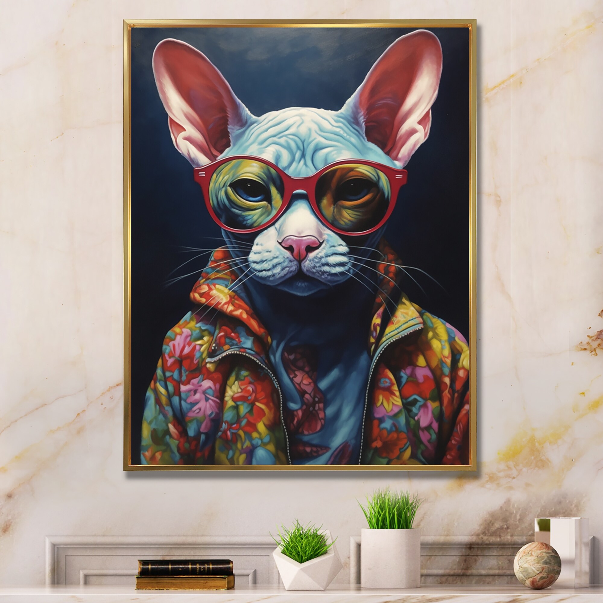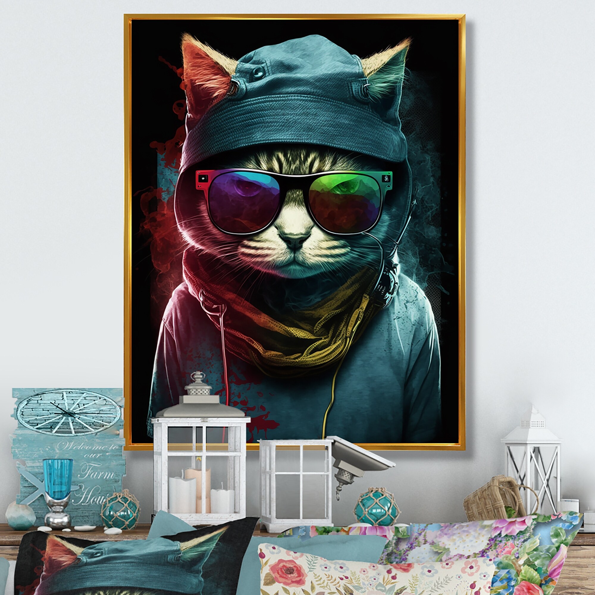Designart "Bohemian Cat With Sunglasses IV" Animals Cat Framed Canvas Wall Art Print