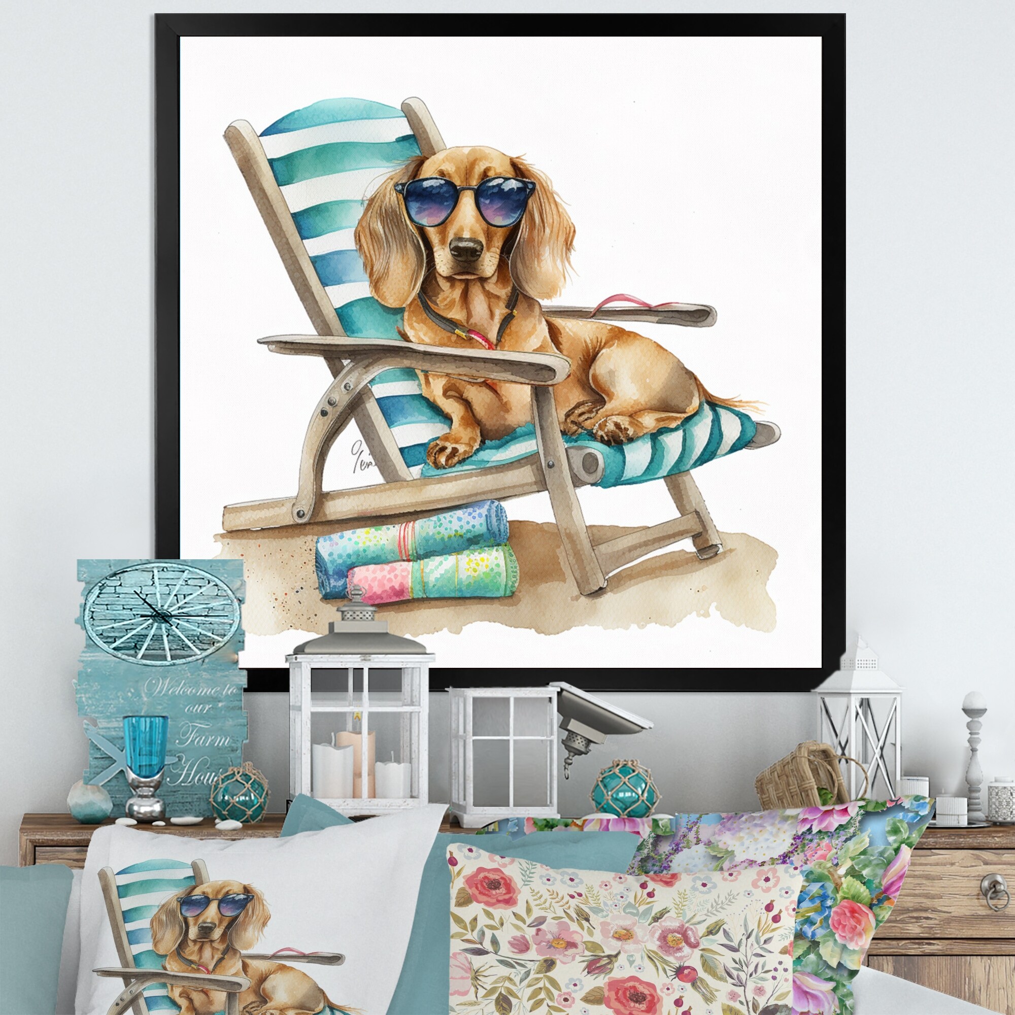 Designart "Dog Lounging on the Beach With Sunglasses V" Animals Framed Art Print