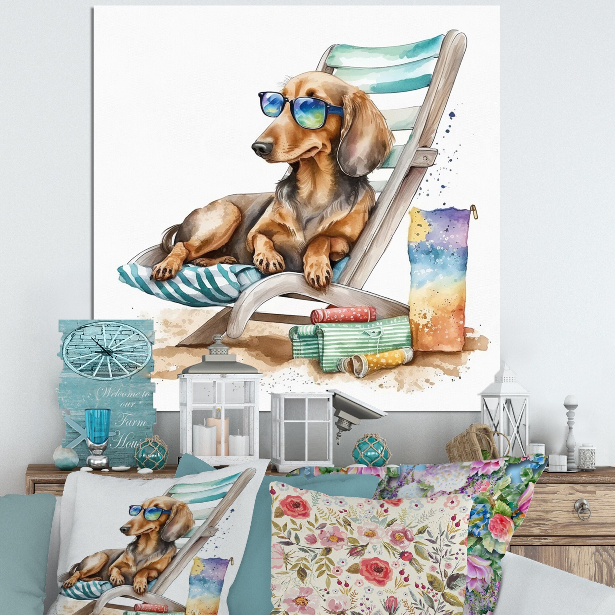 Designart 'Dog Lounging on the Beach With Sunglasses IV' Animals Canvas Wall Art