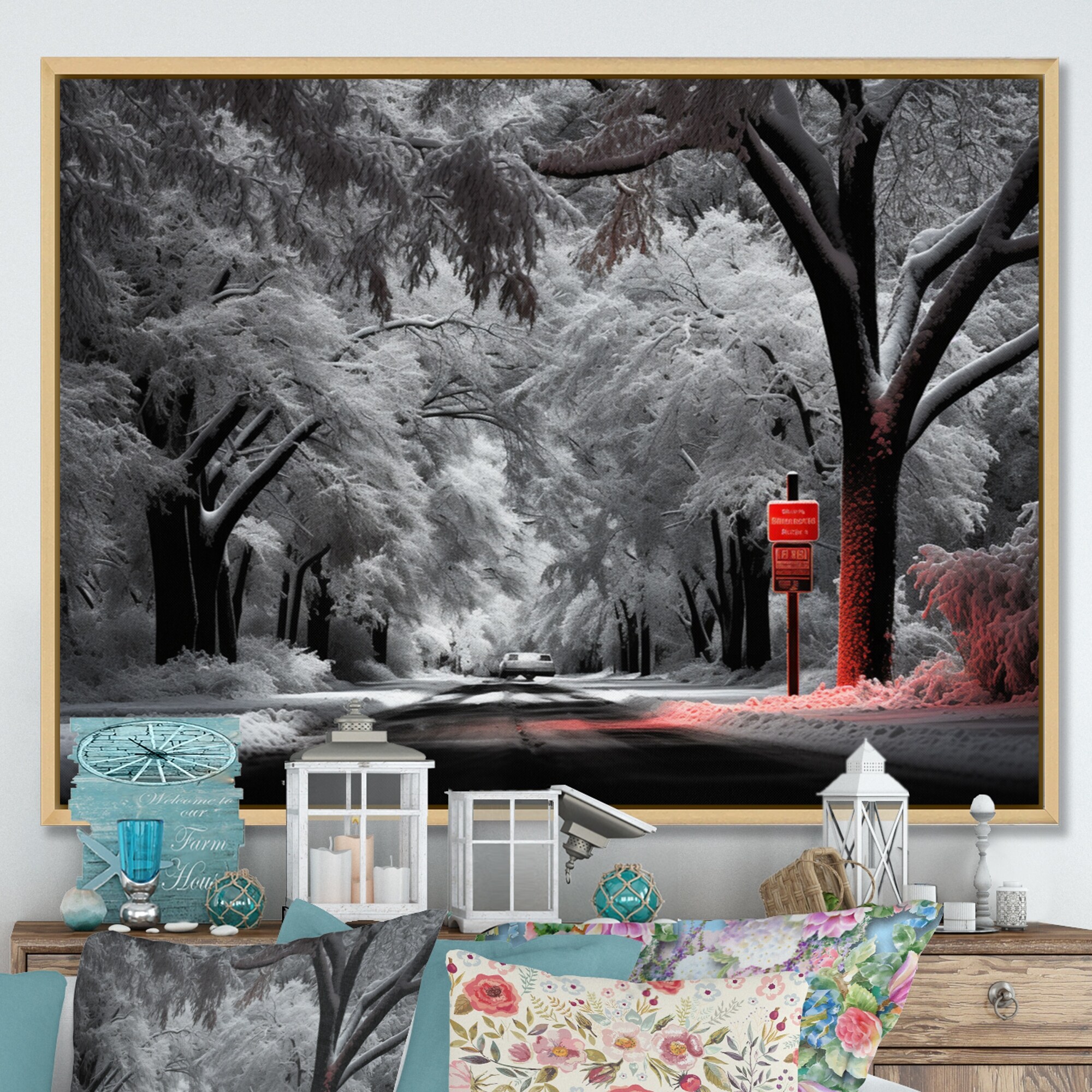 Designart "Red And White Winter Silent Symphony II" Winter Landscape Framed Wall Decor